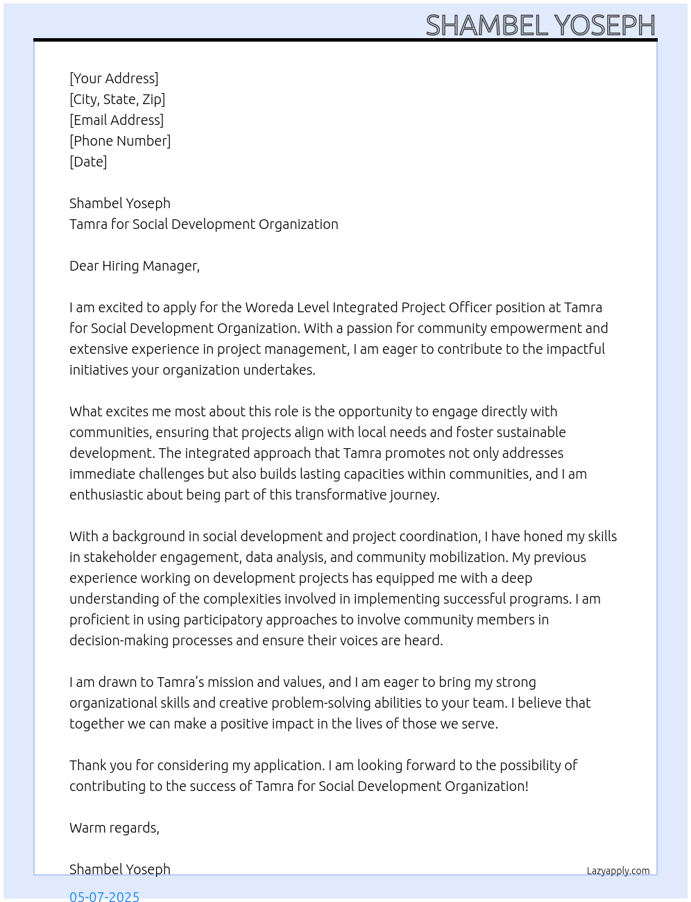 Woreda level integrated project officer Cover Letter At Tamra for social development organization