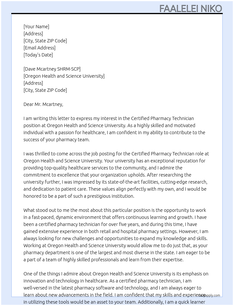 Certified Pharmacy Technician Cover Letter At Oregon Health and Science University