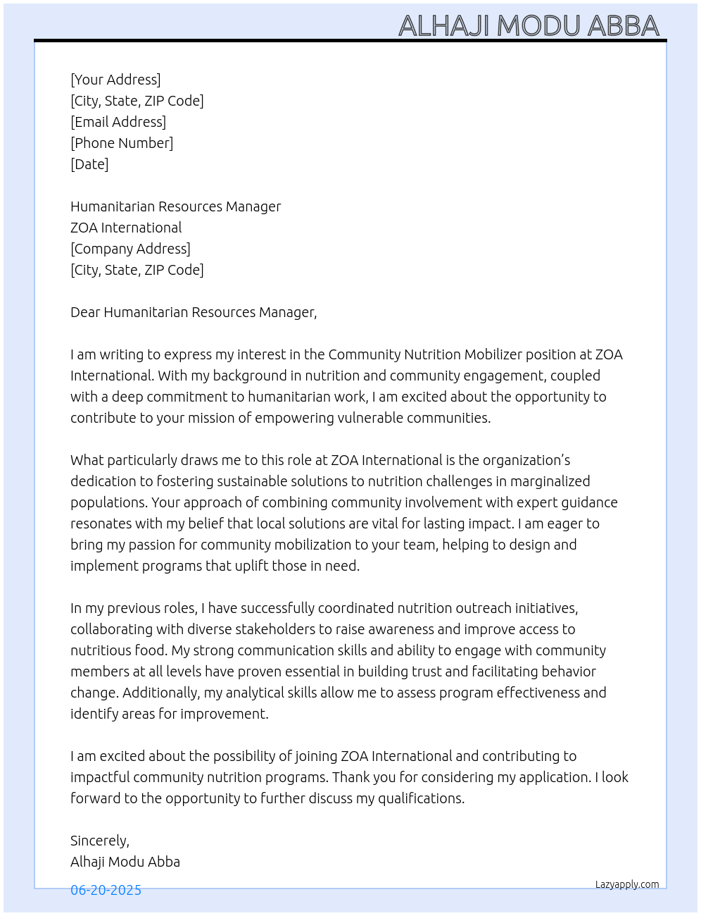 Community Nutrition Mobilizer Cover Letter At ZOA International