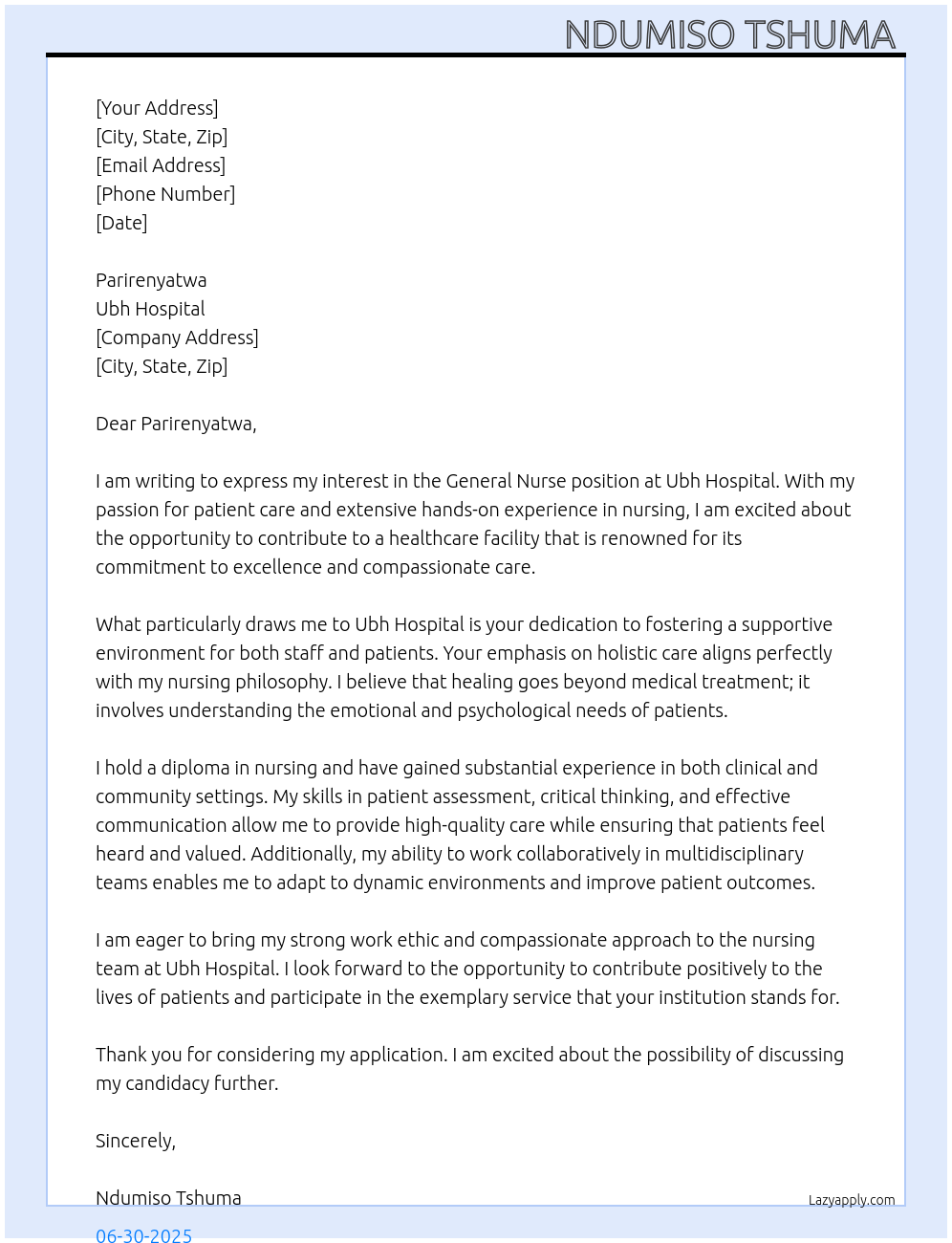 Check out these general nurse cover letter sample and examples previously used by job seekers to land on job interviews as general nurse. Use our AI cover letter generator to create a personalized cover letter as general nurse.