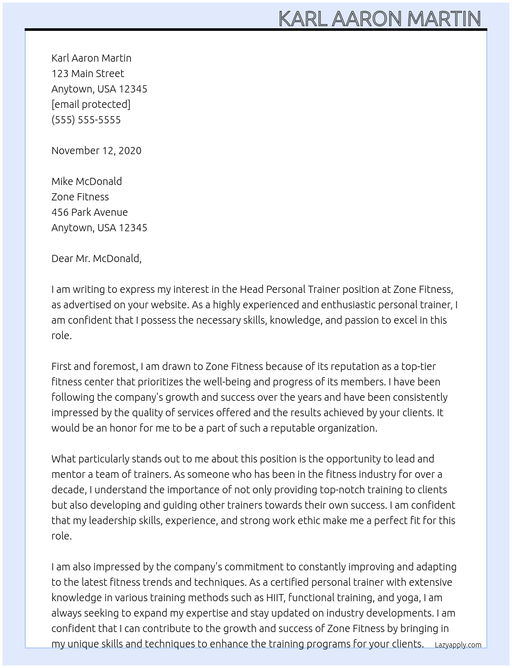 Head Personal Trainer Cover Letter Examples