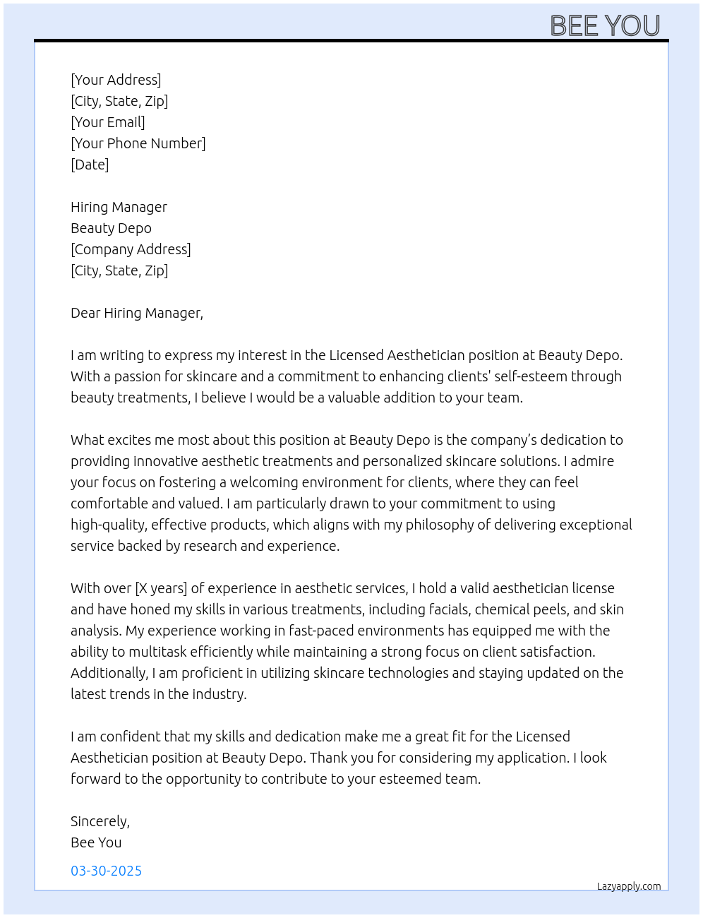 Check out these licensed aesthetician cover letter sample and examples previously used by job seekers to land on job interviews as licensed aesthetician. Use our AI cover letter generator to create a personalized cover letter as licensed aesthetician.