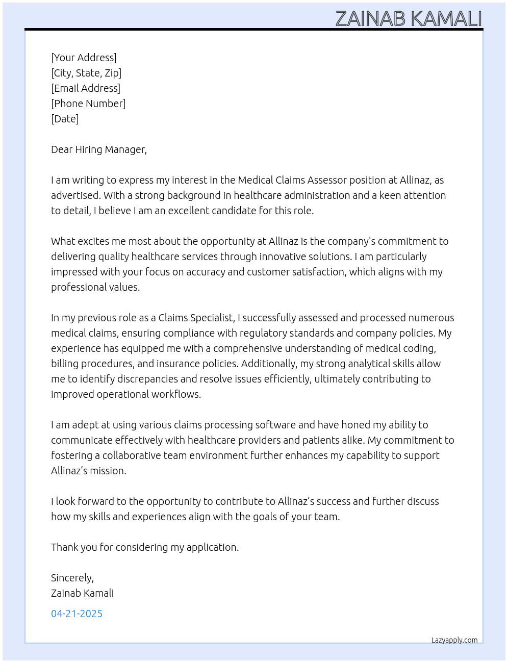 Medical Claims Assessor Cover Letter Examples And Template
