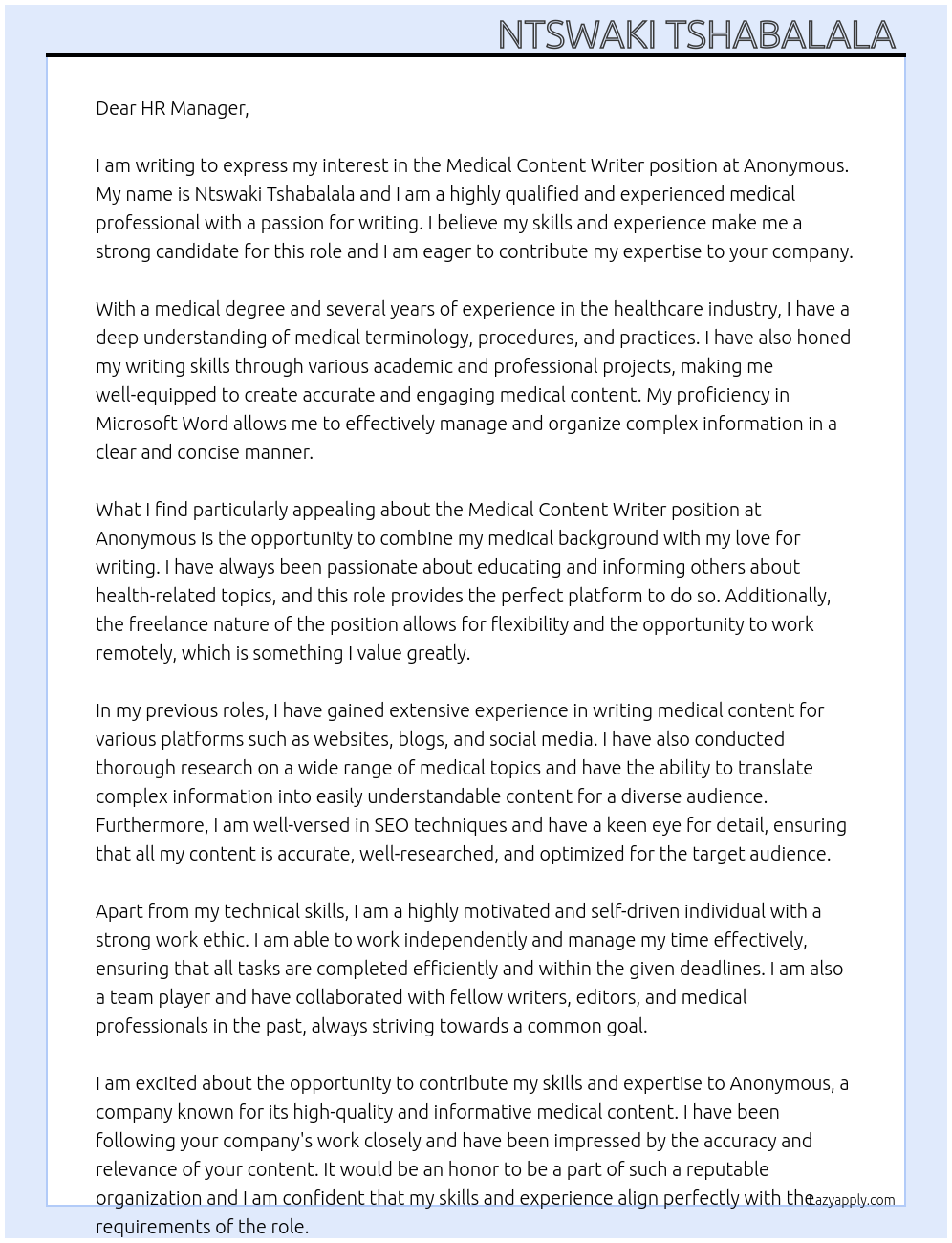 plus clinical development process hence I can produce quality work within the stipulated time.