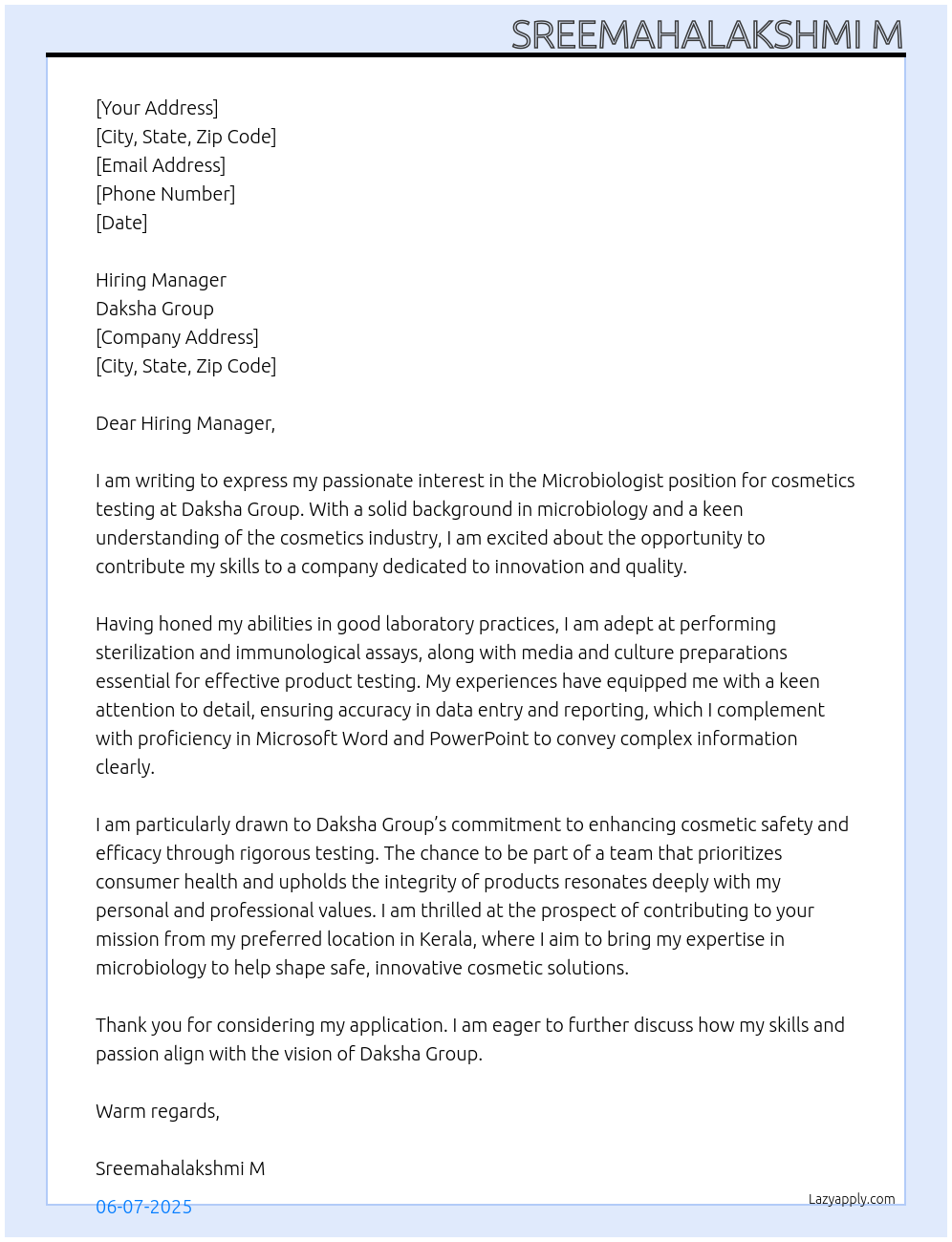 Microbiologist cosmetics testing Cover Letter At Daksha group