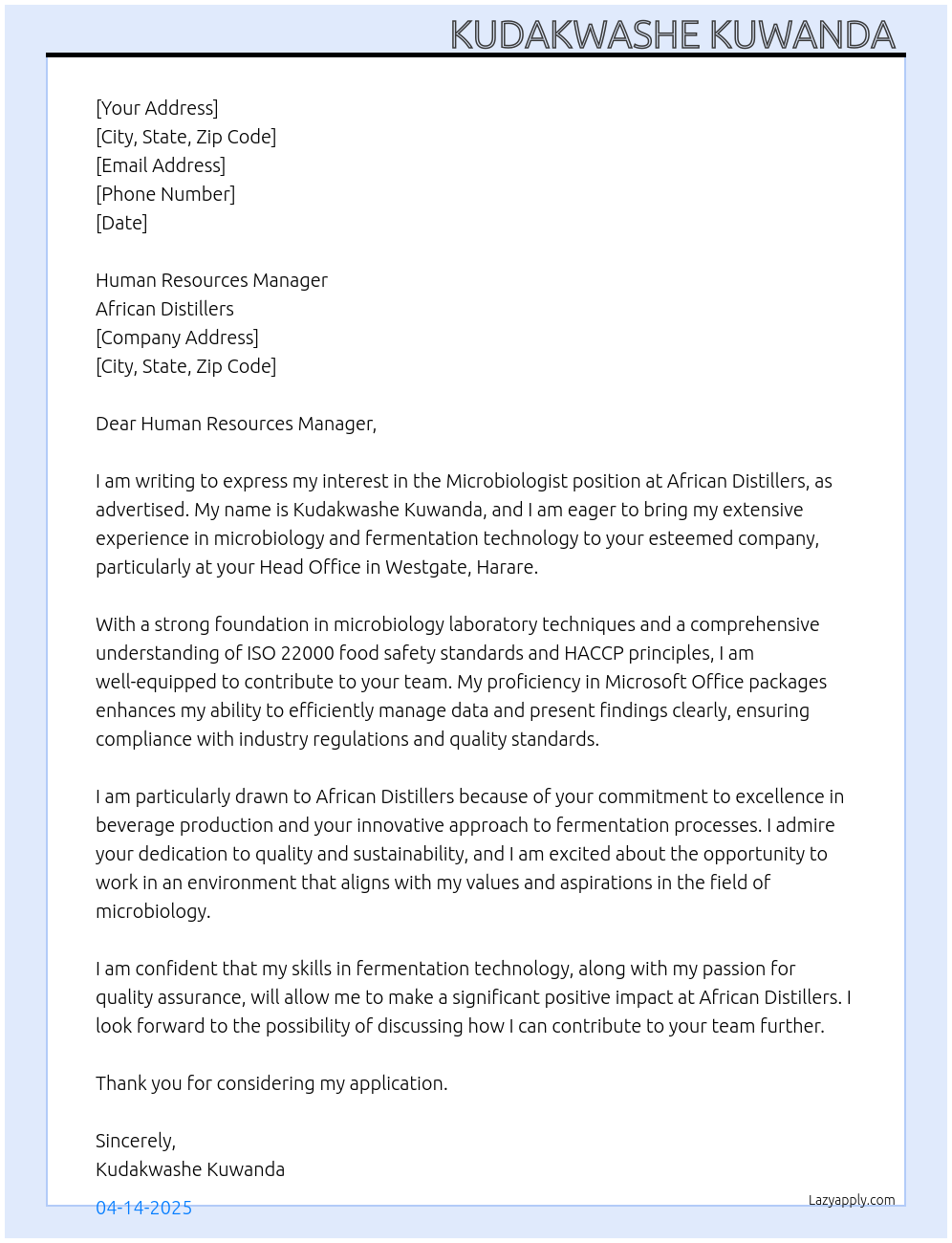 Microbiologists Cover Letter At African Distillers