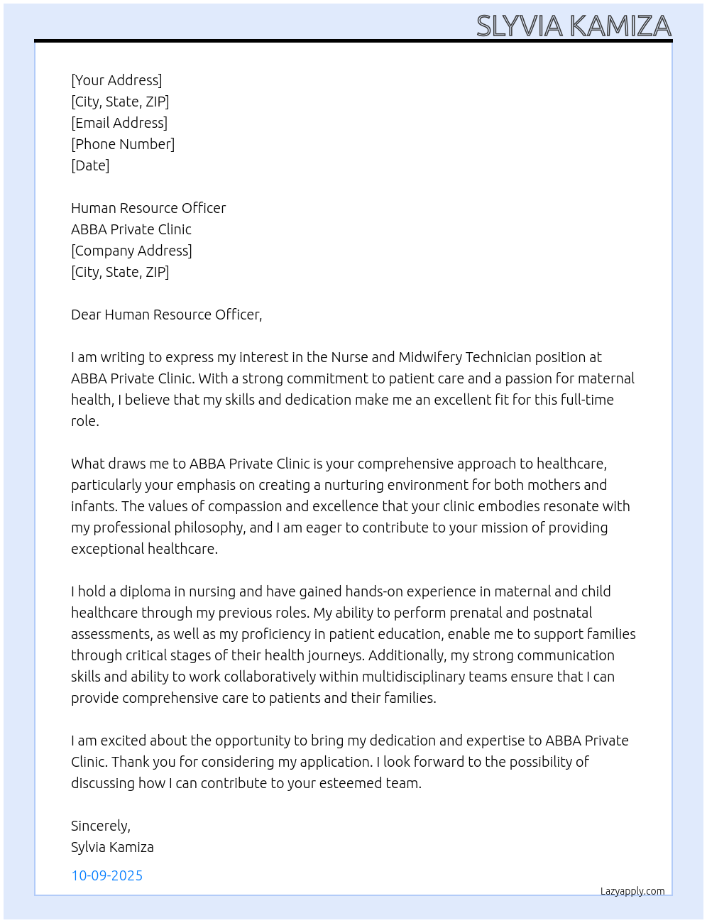 nurse and midwifery technician Cover Letter At ABBA private clinic