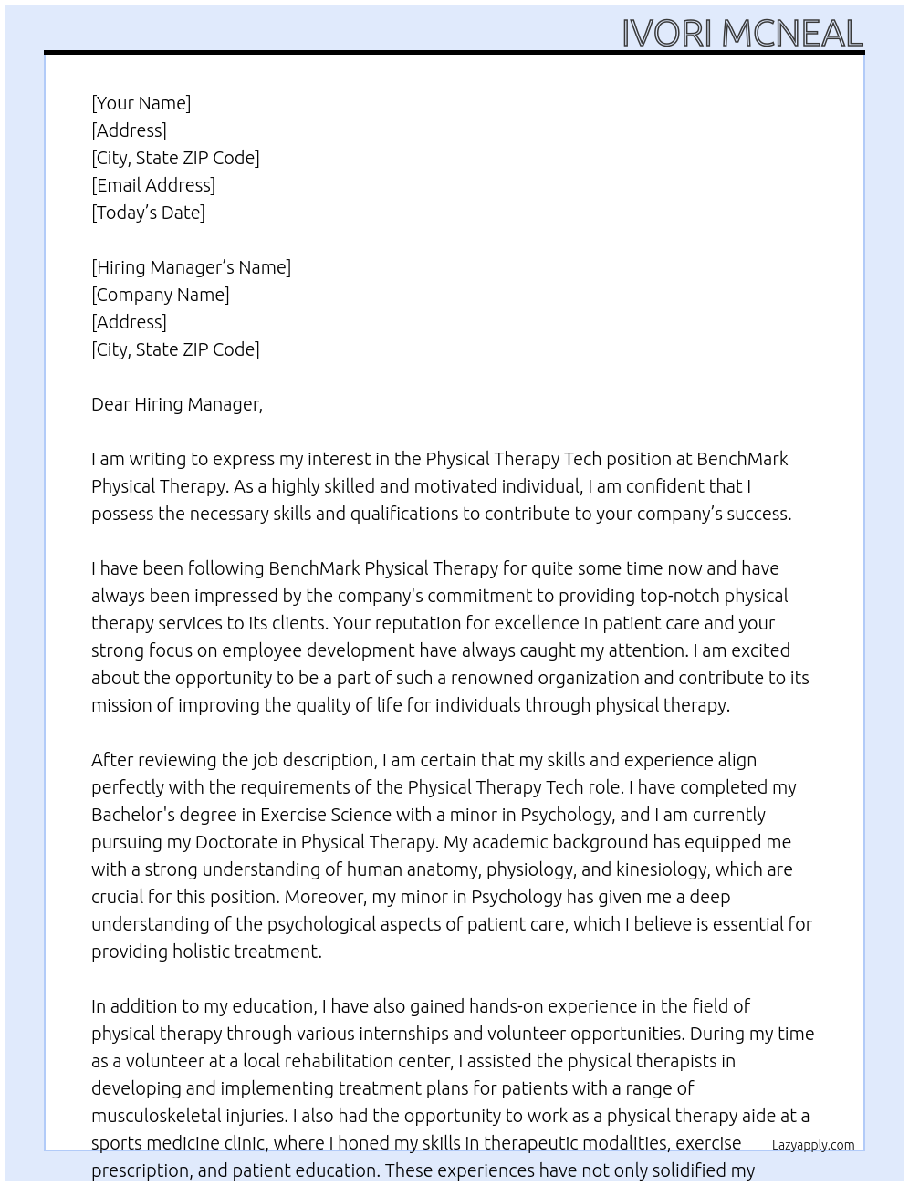 Physical Therapy Tech Cover Letter At BenchMark Physical Therapy