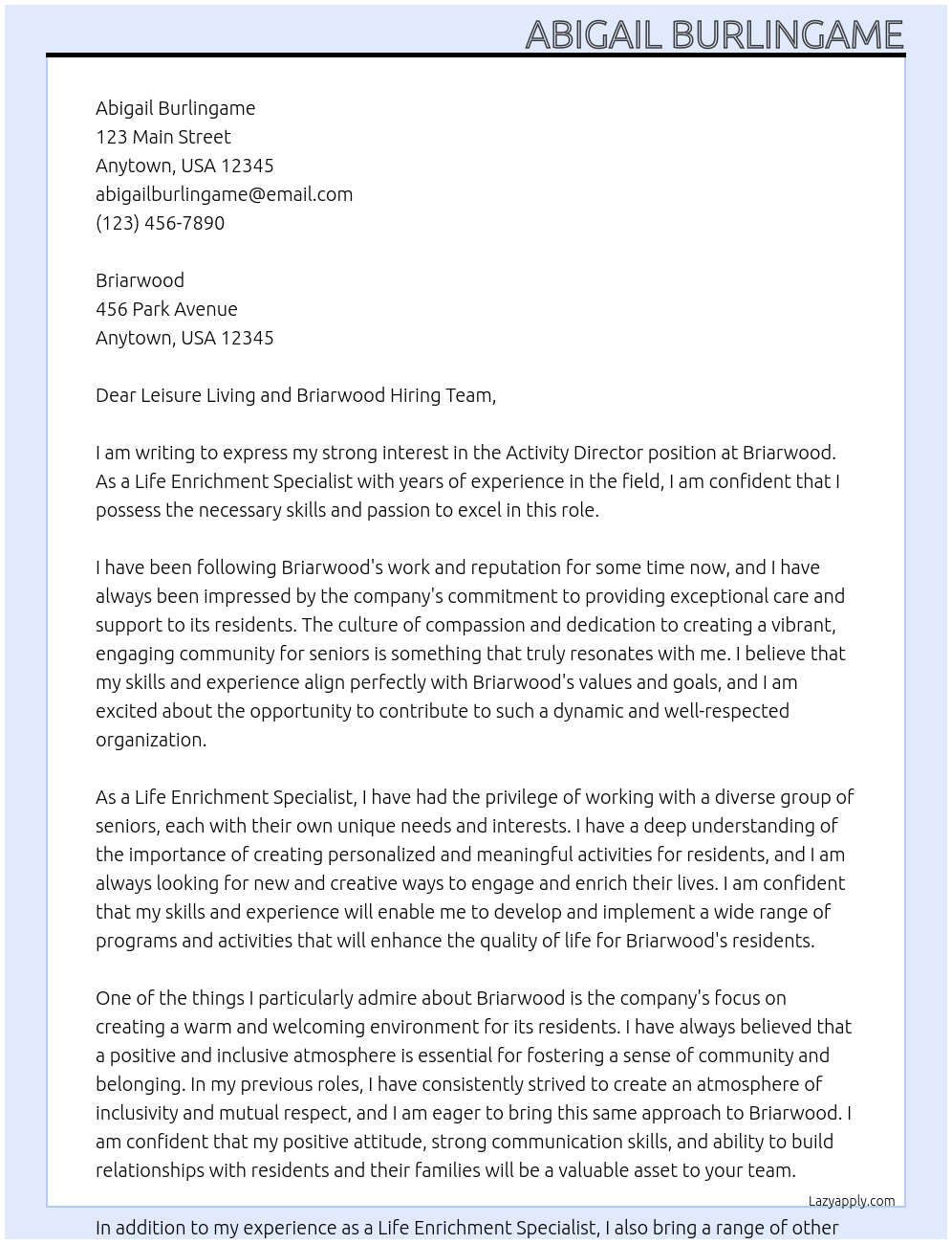 Activity Director Cover Letter At Briarwood