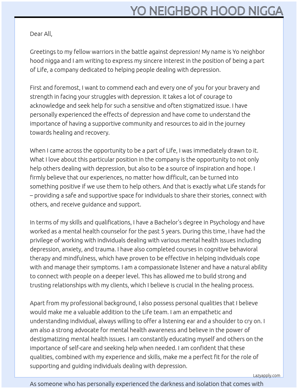 Check out these all people dealing with depression cover letter sample and examples previously used by job seekers to land on job interviews as all people dealing with depression. Use our AI cover letter generator to create a personalized cover letter as all people dealing with depression.