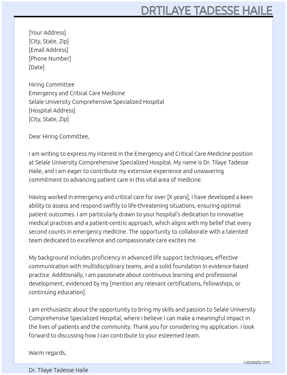 Emergency and critical care medicine Cover Letter At Tadesse