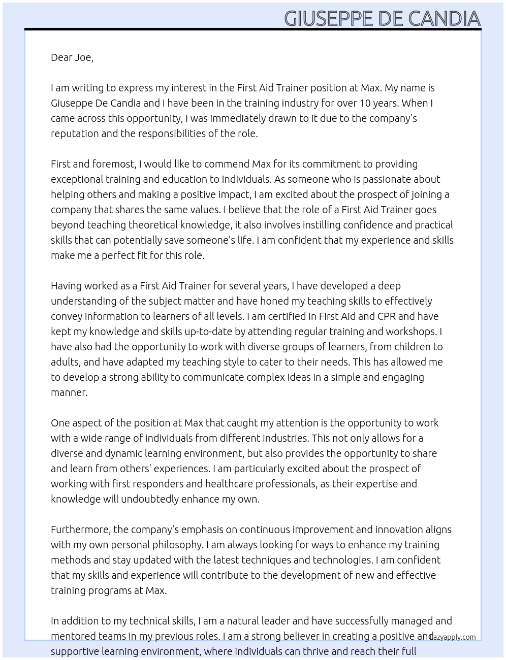Check out these first aid trainer cover letter sample and examples previously used by job seekers to land on job interviews as first aid trainer. Use our AI cover letter generator to create a personalized cover letter as first aid trainer.