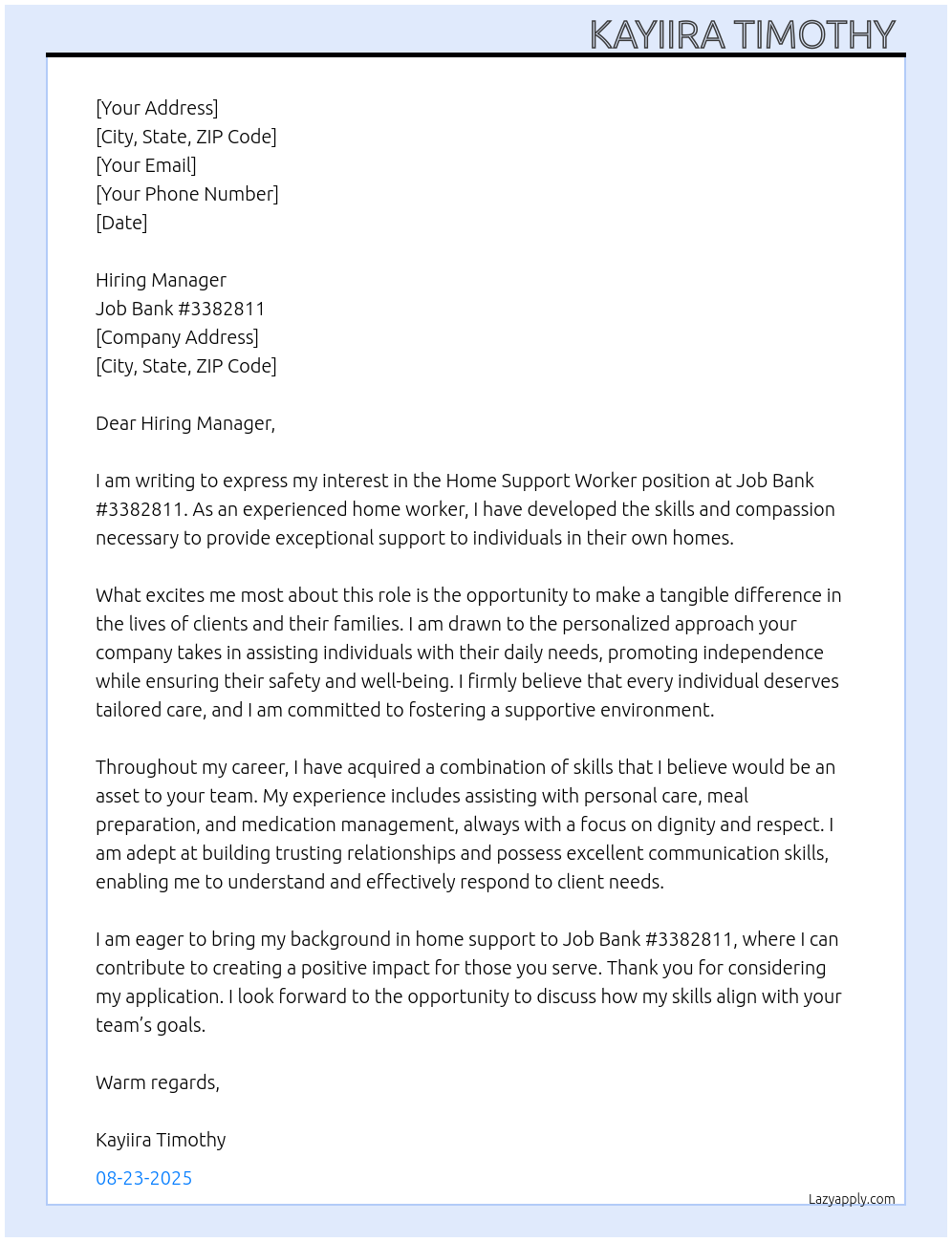 Check out these home support worker cover letter sample and examples previously used by job seekers to land on job interviews as home support worker. Use our AI cover letter generator to create a personalized cover letter as home support worker.