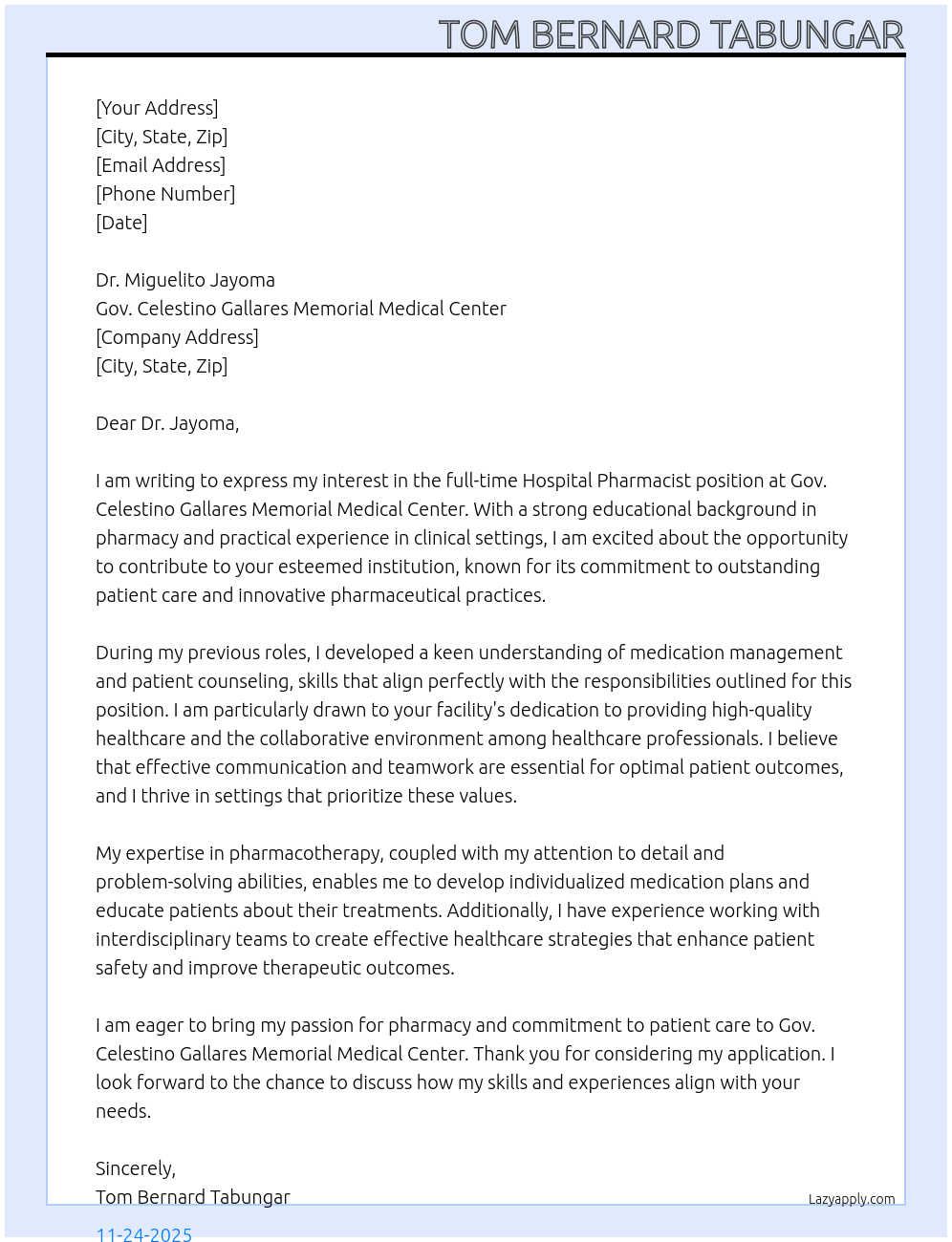 Hospital Pharmacist At GOV. CELESTINO GALLARES MEMORIAL MEDICAL CENTER  Cover Letter