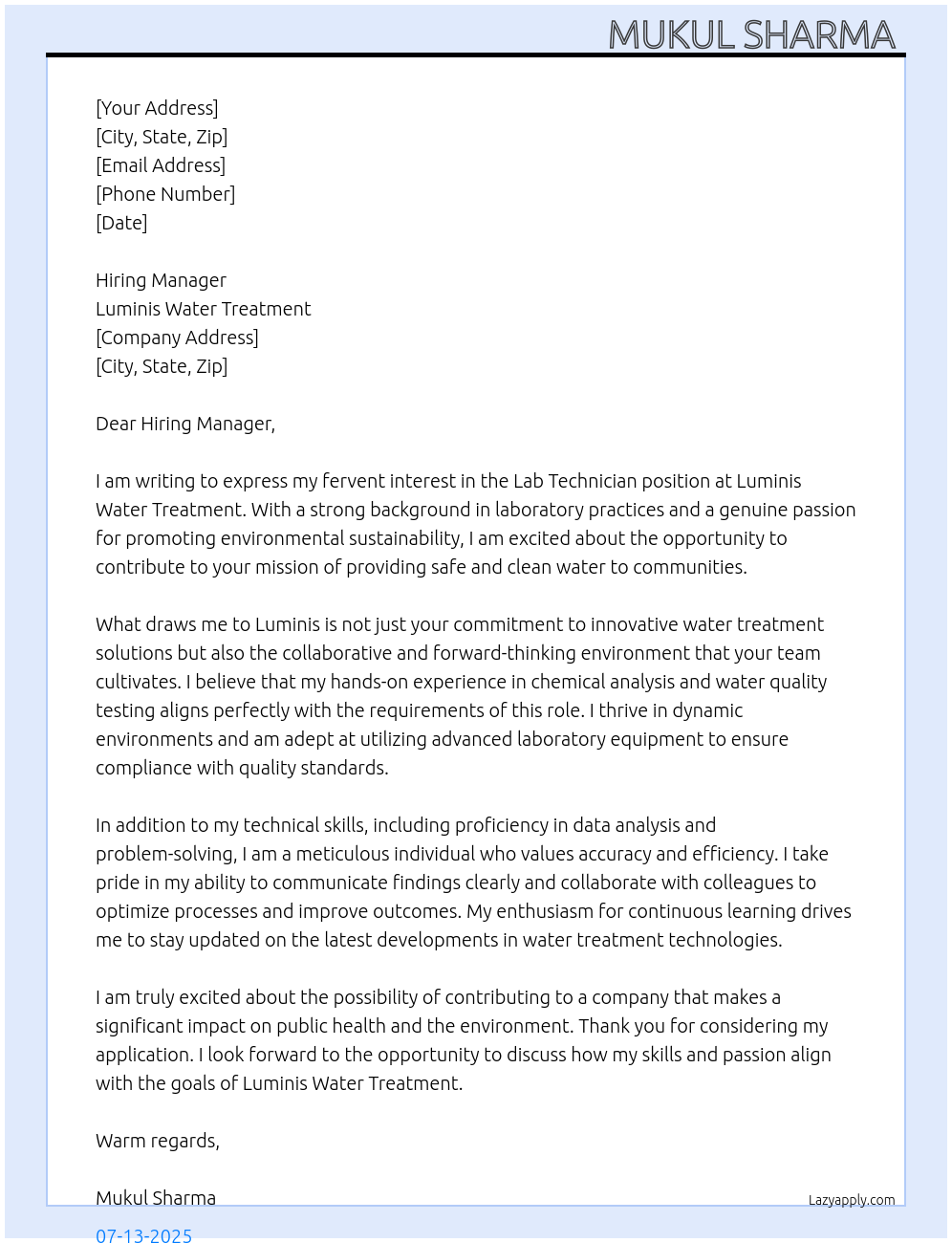Lab technicians Cover Letter At Luminis Water Treatment