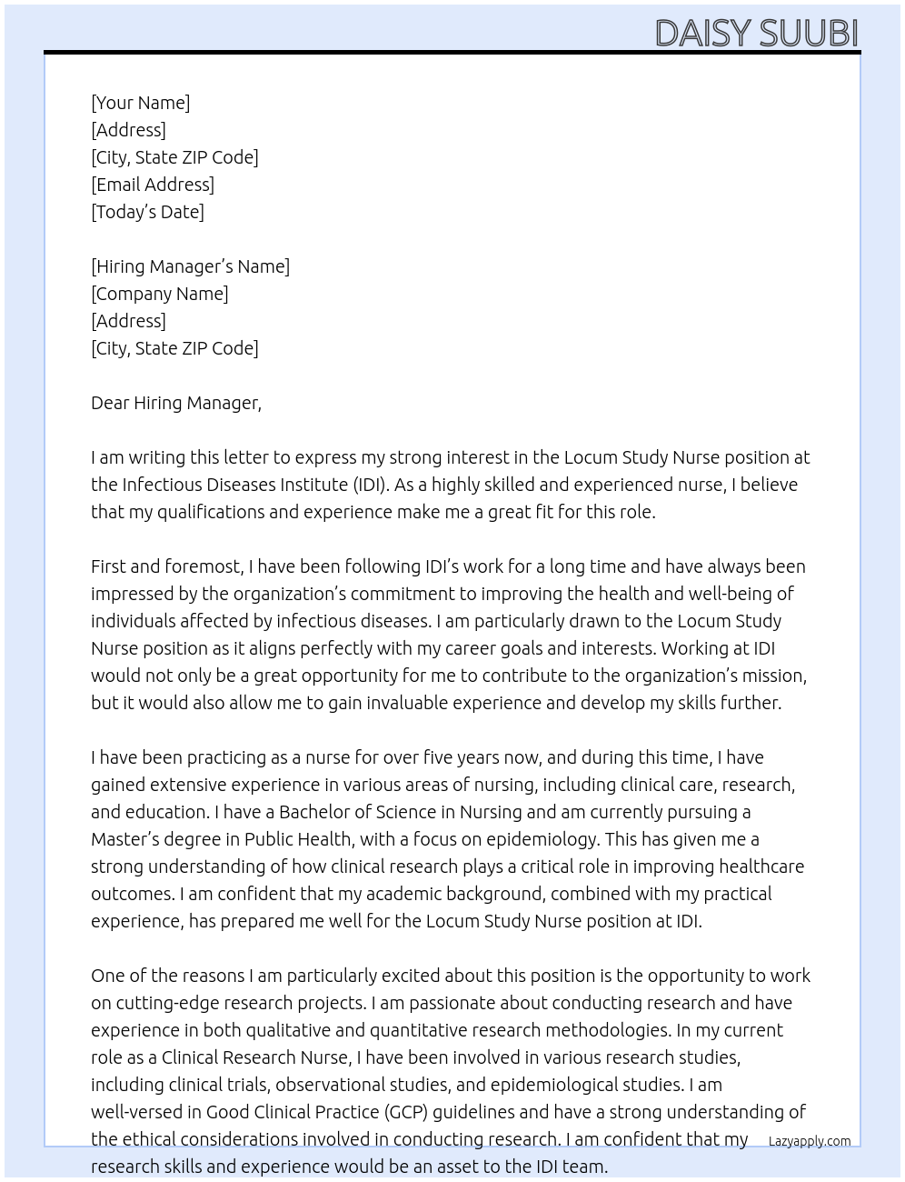 Check out these locum study nurse cover letter sample and examples previously used by job seekers to land on job interviews as locum study nurse. Use our AI cover letter generator to create a personalized cover letter as locum study nurse.