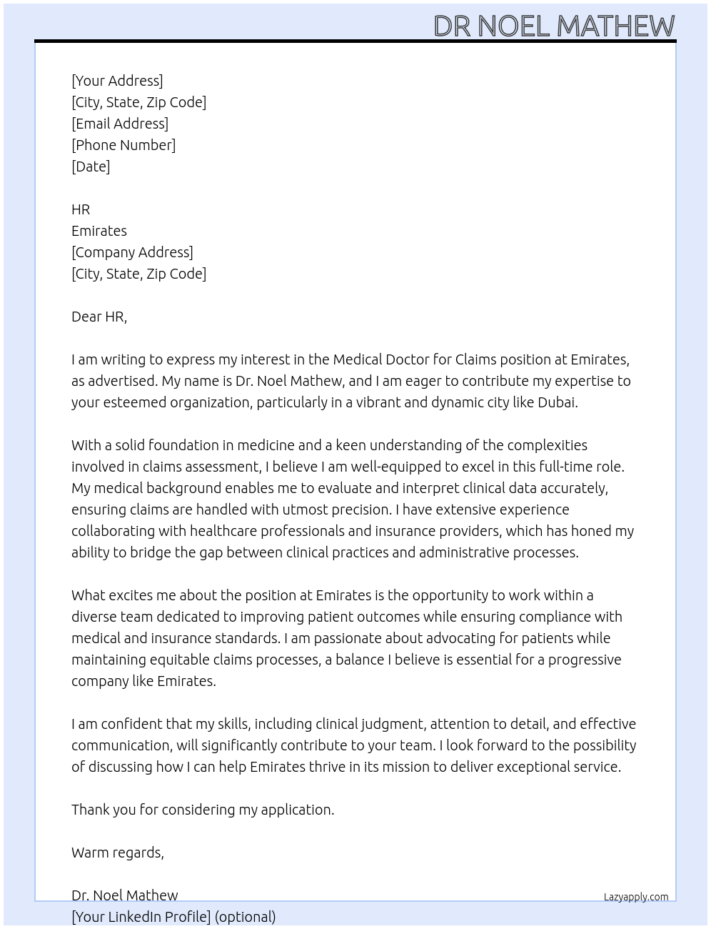 Check out these medical doctor for claims cover letter sample and examples previously used by job seekers to land on job interviews as medical doctor for claims. Use our AI cover letter generator to create a personalized cover letter as medical doctor for claims.