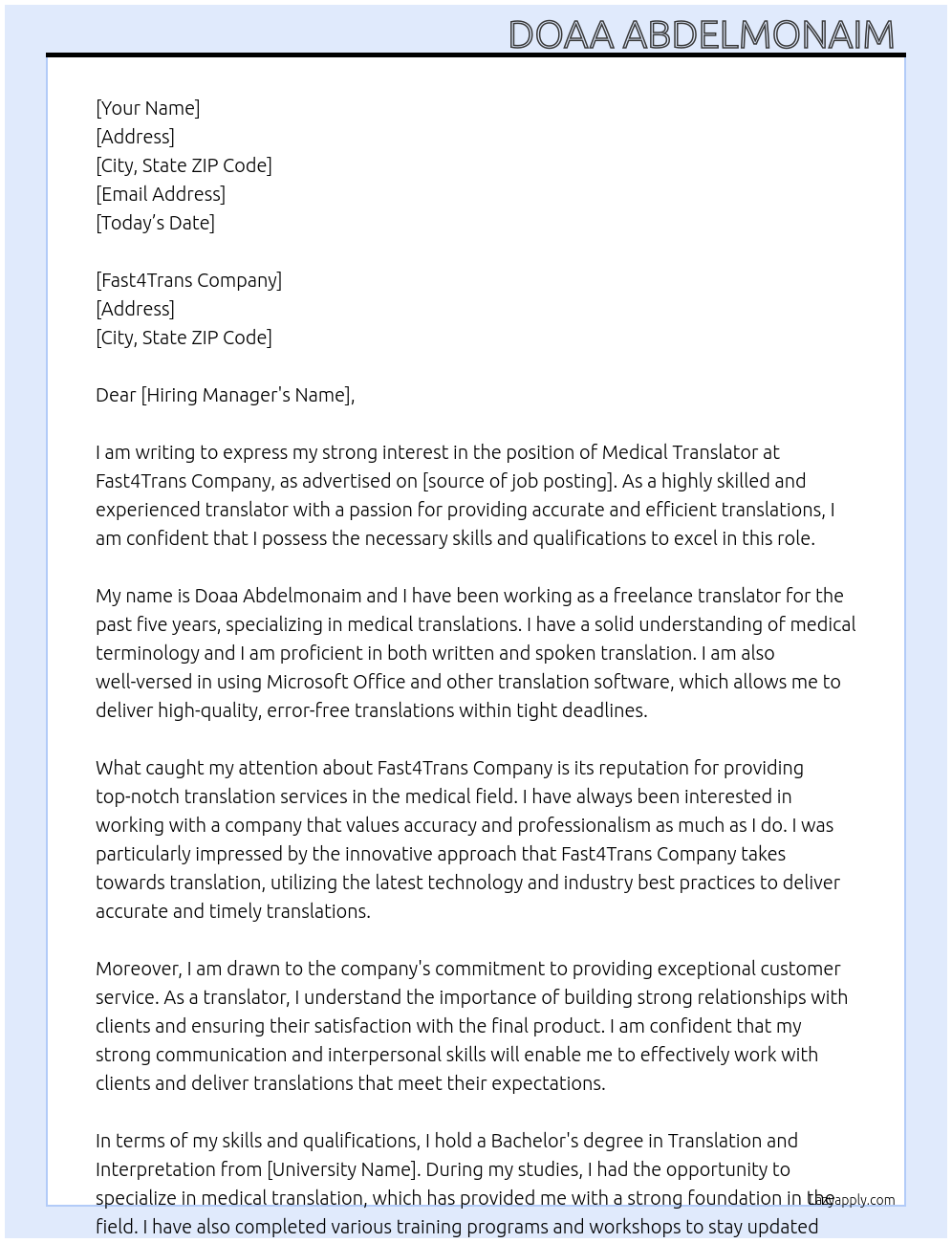 MEDICAL TRANSLATOR Cover Letter At medical translator