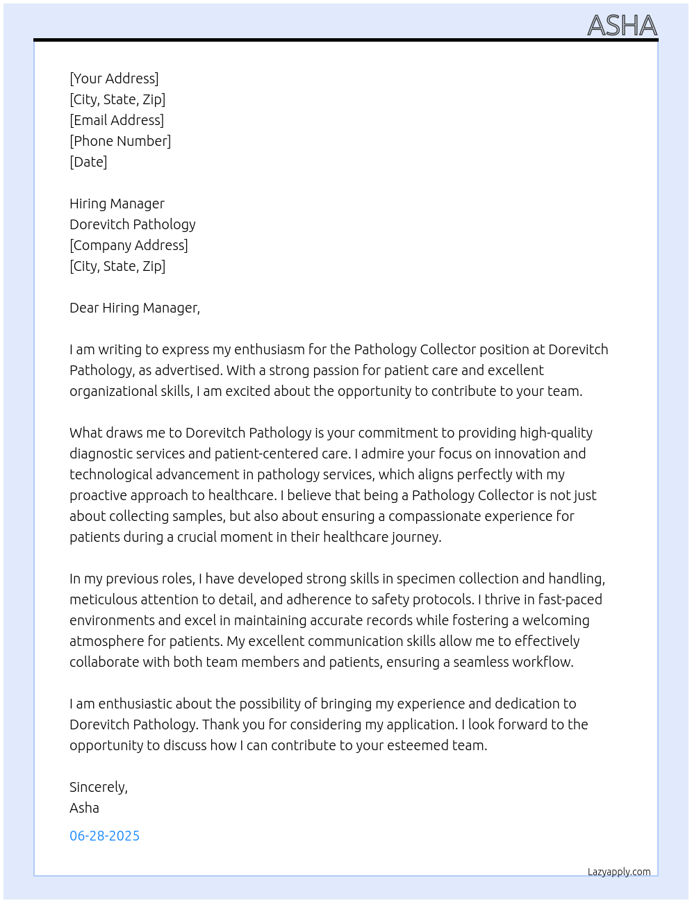 Check out these pathology collector cover letter sample and examples previously used by job seekers to land on job interviews as pathology collector. Use our AI cover letter generator to create a personalized cover letter as pathology collector.