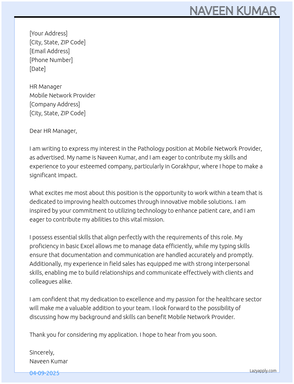 Check out these pathology cover letter sample and examples previously used by job seekers to land on job interviews as pathology. Use our AI cover letter generator to create a personalized cover letter as pathology.