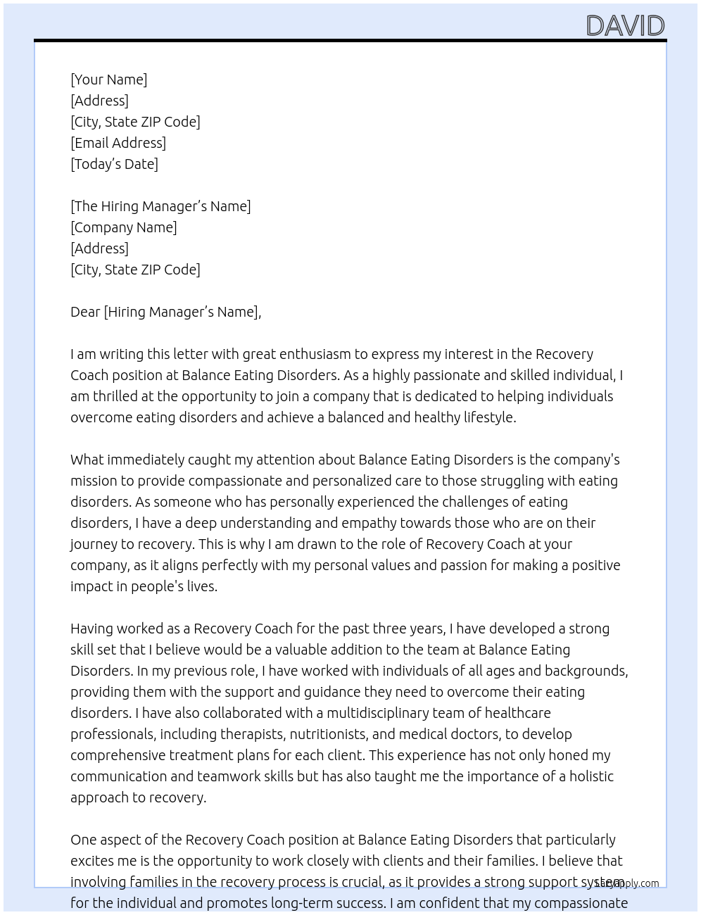 Check out these recovery coach cover letter sample and examples previously used by job seekers to land on job interviews as recovery coach. Use our AI cover letter generator to create a personalized cover letter as recovery coach.