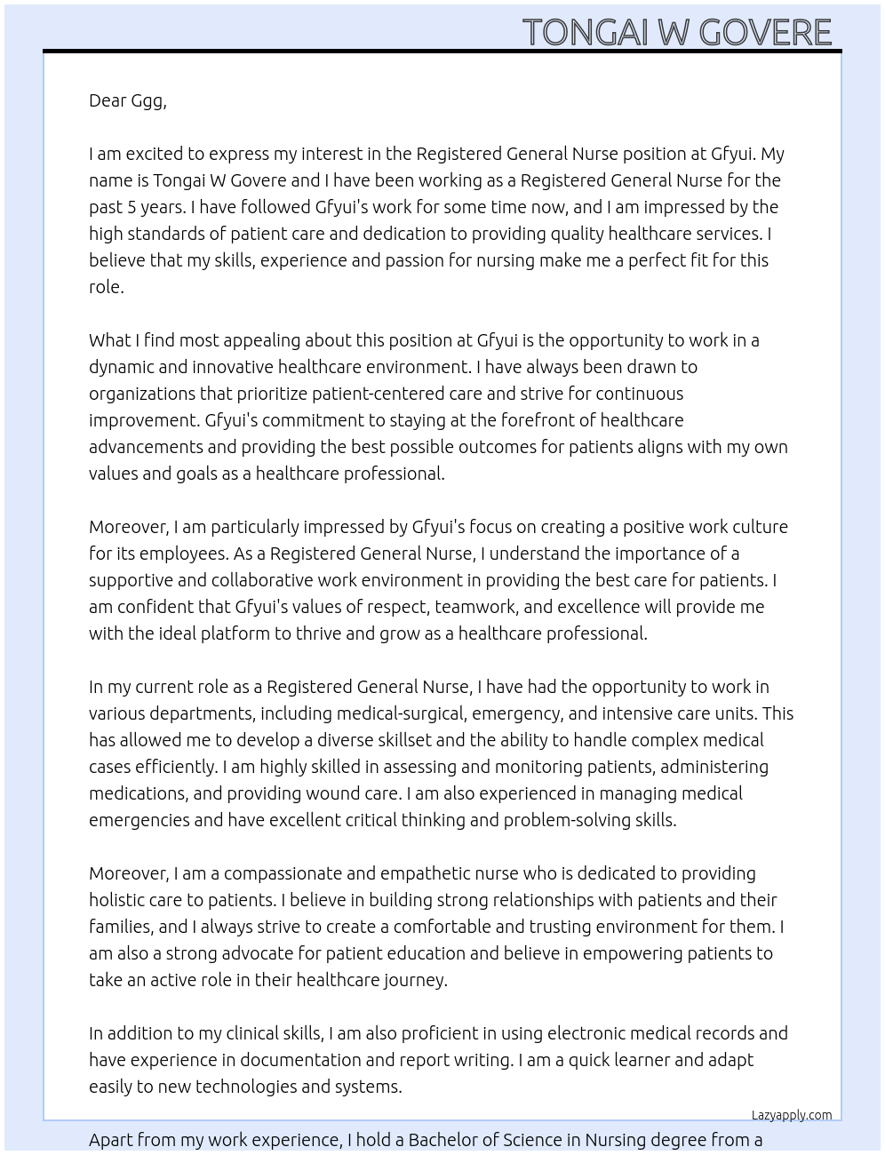 Check out these registered general nurse cover letter sample and examples previously used by job seekers to land on job interviews as registered general nurse. Use our AI cover letter generator to create a personalized cover letter as registered general nurse.
