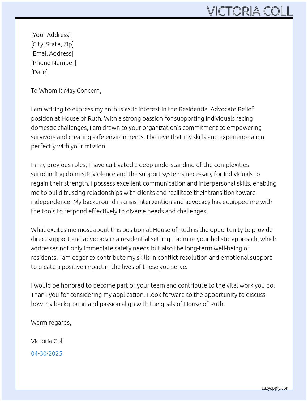 Check out these residential advocate relief cover letter sample and examples previously used by job seekers to land on job interviews as residential advocate relief. Use our AI cover letter generator to create a personalized cover letter as residential advocate relief.