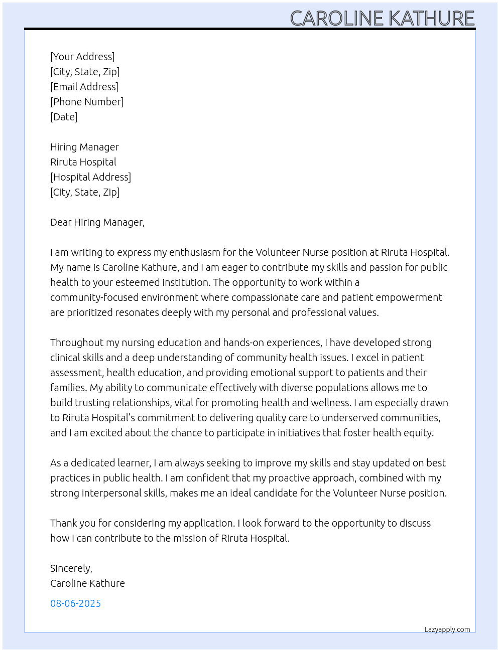 Check out these volunteer nurse cover letter sample and examples previously used by job seekers to land on job interviews as volunteer nurse. Use our AI cover letter generator to create a personalized cover letter as volunteer nurse.