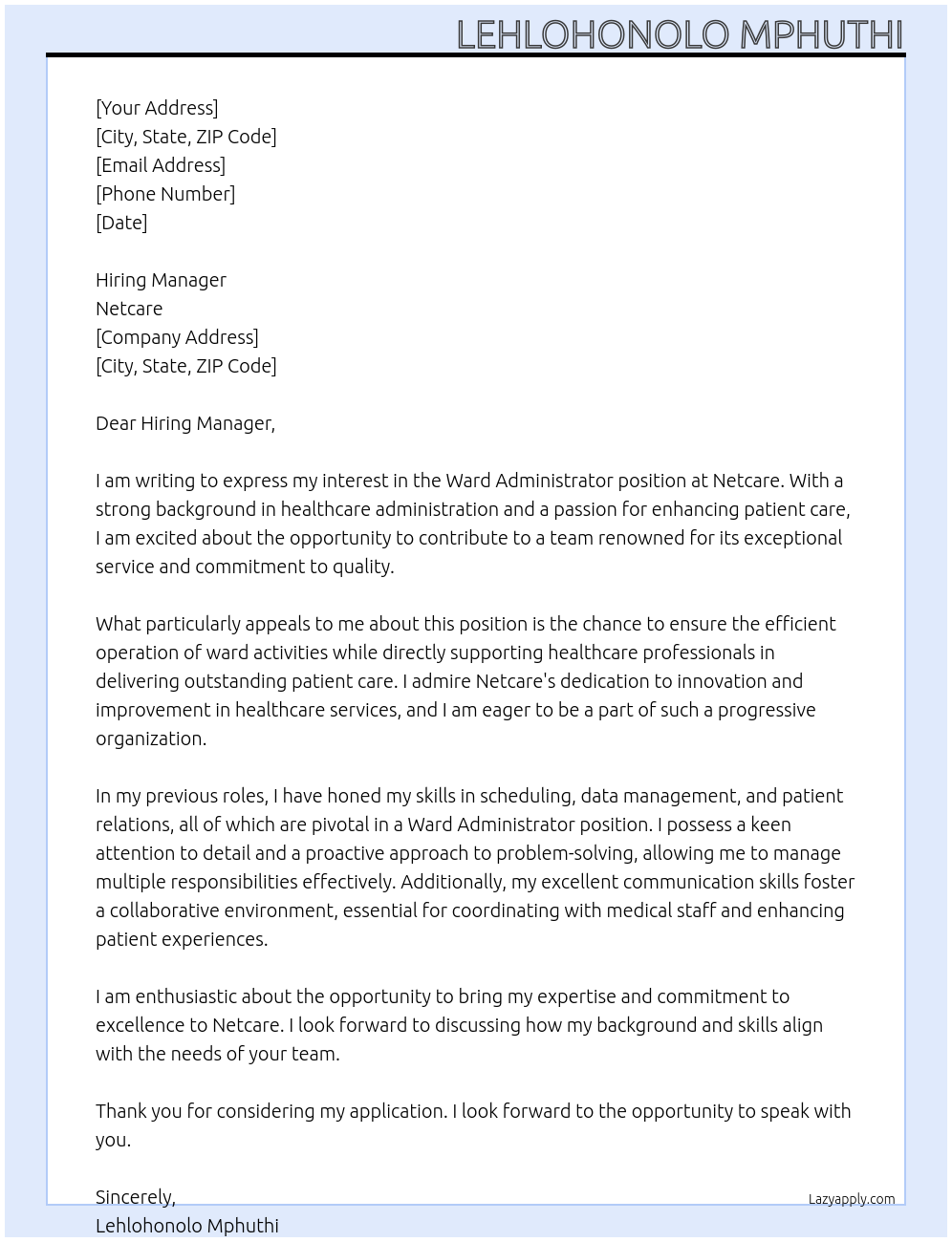 Check out these ward administrator cover letter sample and examples previously used by job seekers to land on job interviews as ward administrator. Use our AI cover letter generator to create a personalized cover letter as ward administrator.
