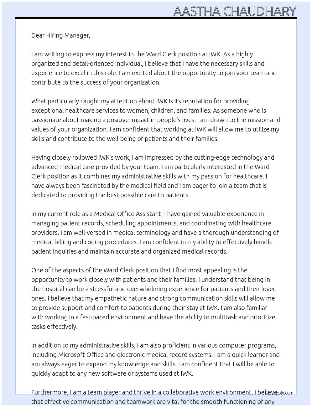 Check out these ward clerk cover letter sample and examples previously used by job seekers to land on job interviews as ward clerk. Use our AI cover letter generator to create a personalized cover letter as ward clerk.