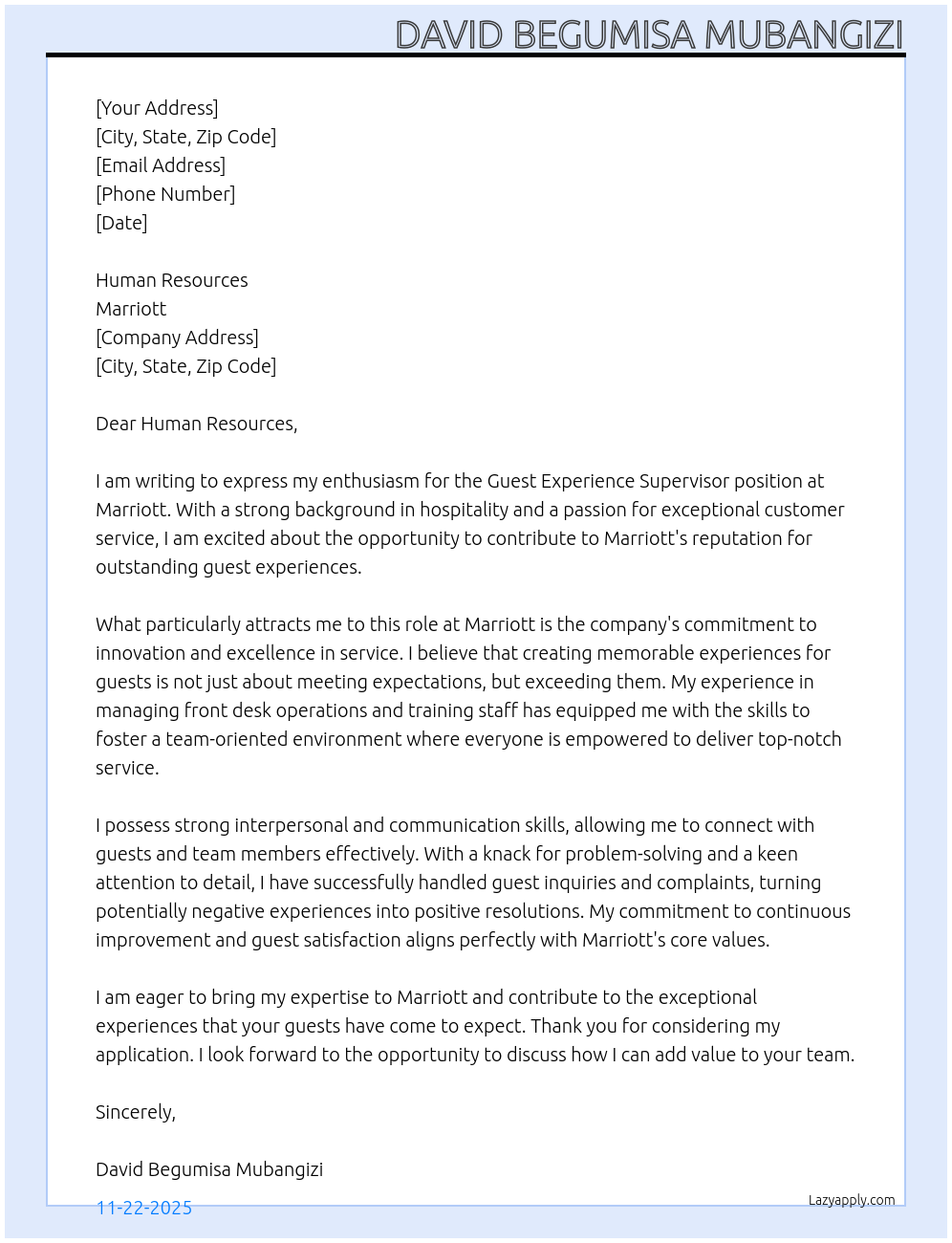 Check out these guest experience supervisor cover letter sample and examples previously used by job seekers to land on job interviews as guest experience supervisor. Use our AI cover letter generator to create a personalized cover letter as guest experience supervisor.