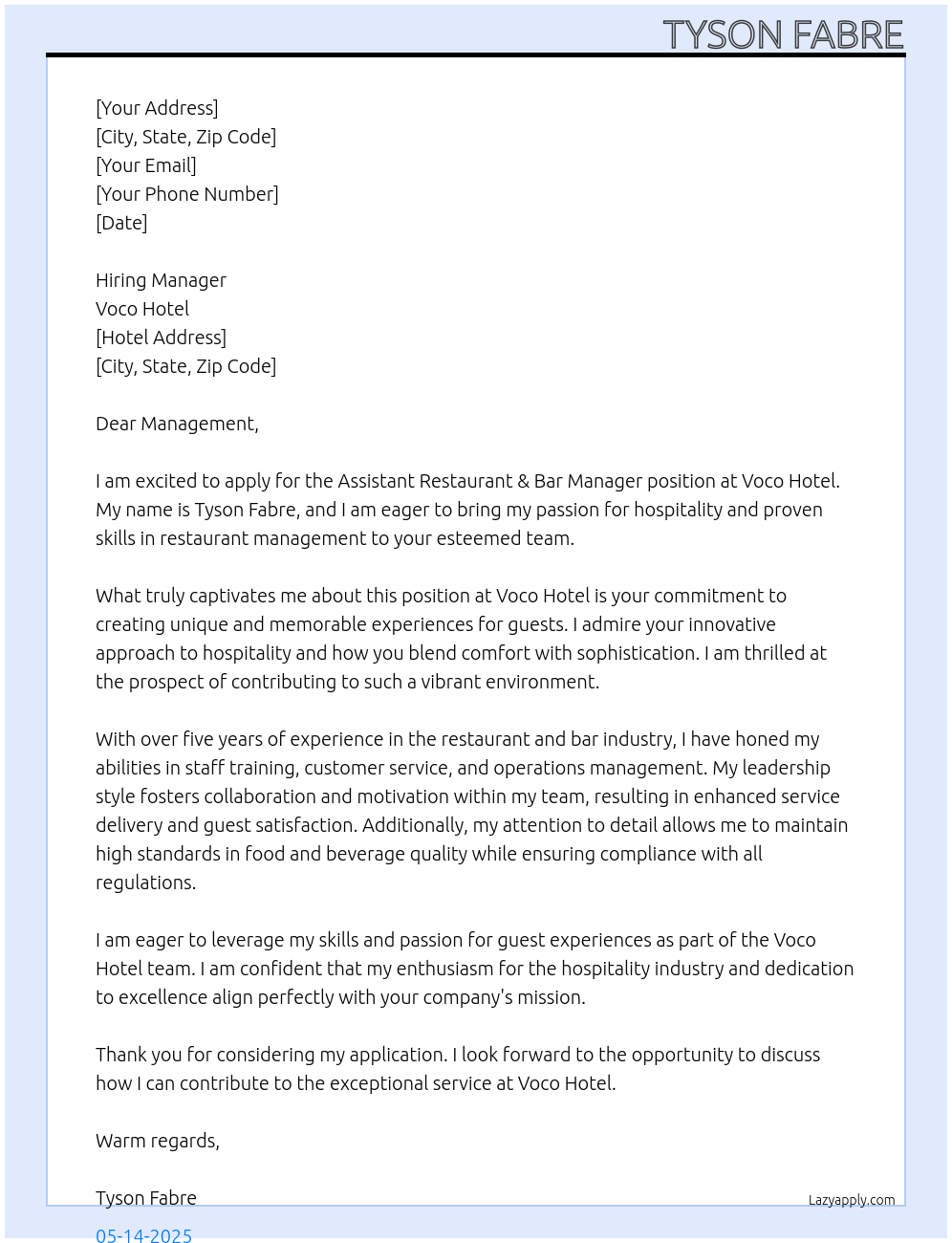 Asistant Restaurant & Bar Manager Cover Letter At Voco Hotel