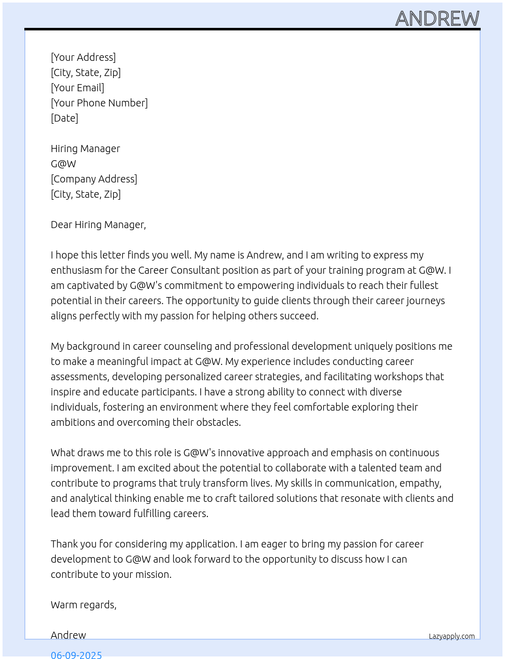 Check out these career consultants cover letter sample and examples previously used by job seekers to land on job interviews as career consultants. Use our AI cover letter generator to create a personalized cover letter as career consultants.