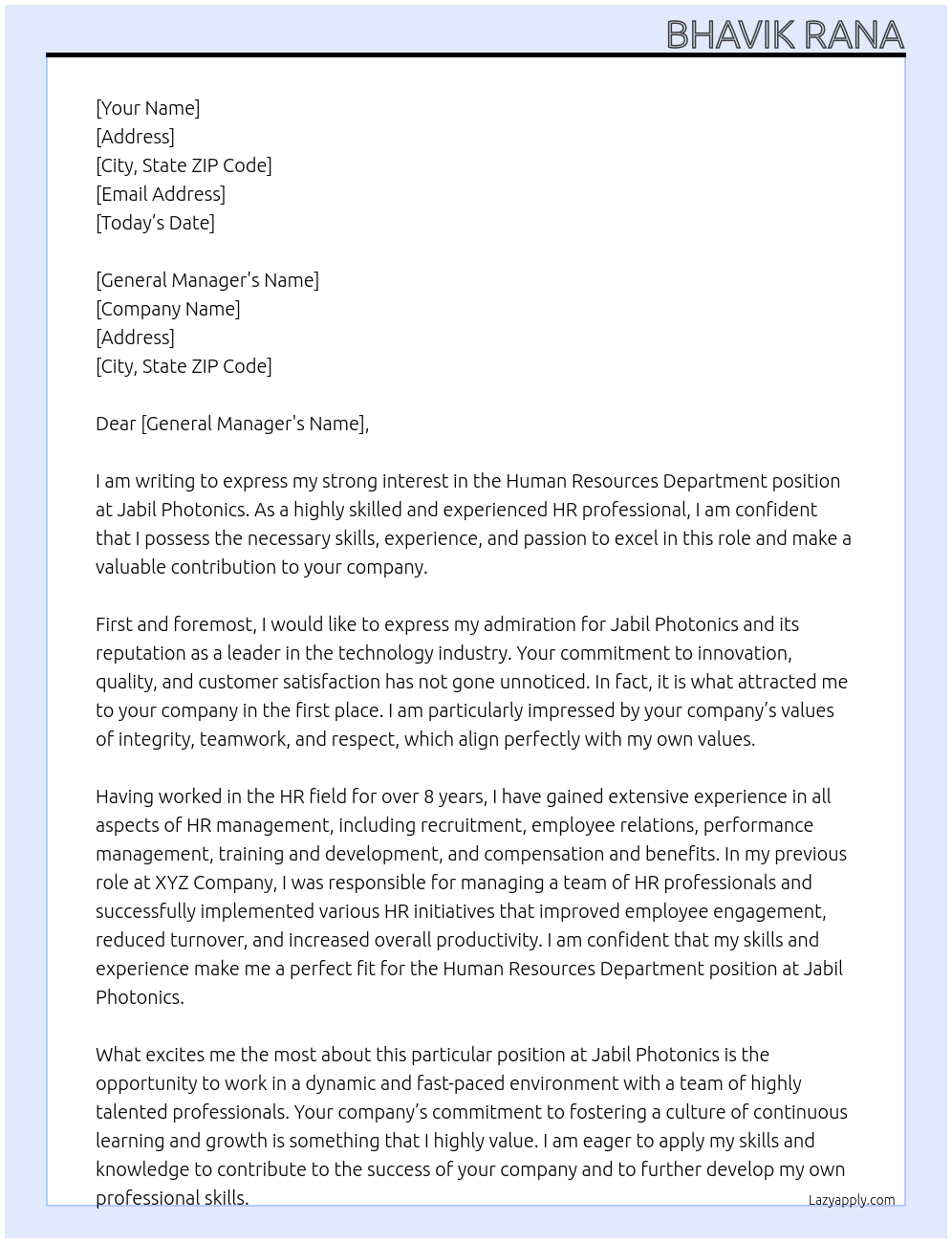 Check out these human resources department cover letter sample and examples previously used by job seekers to land on job interviews as human resources department. Use our AI cover letter generator to create a personalized cover letter as human resources department.