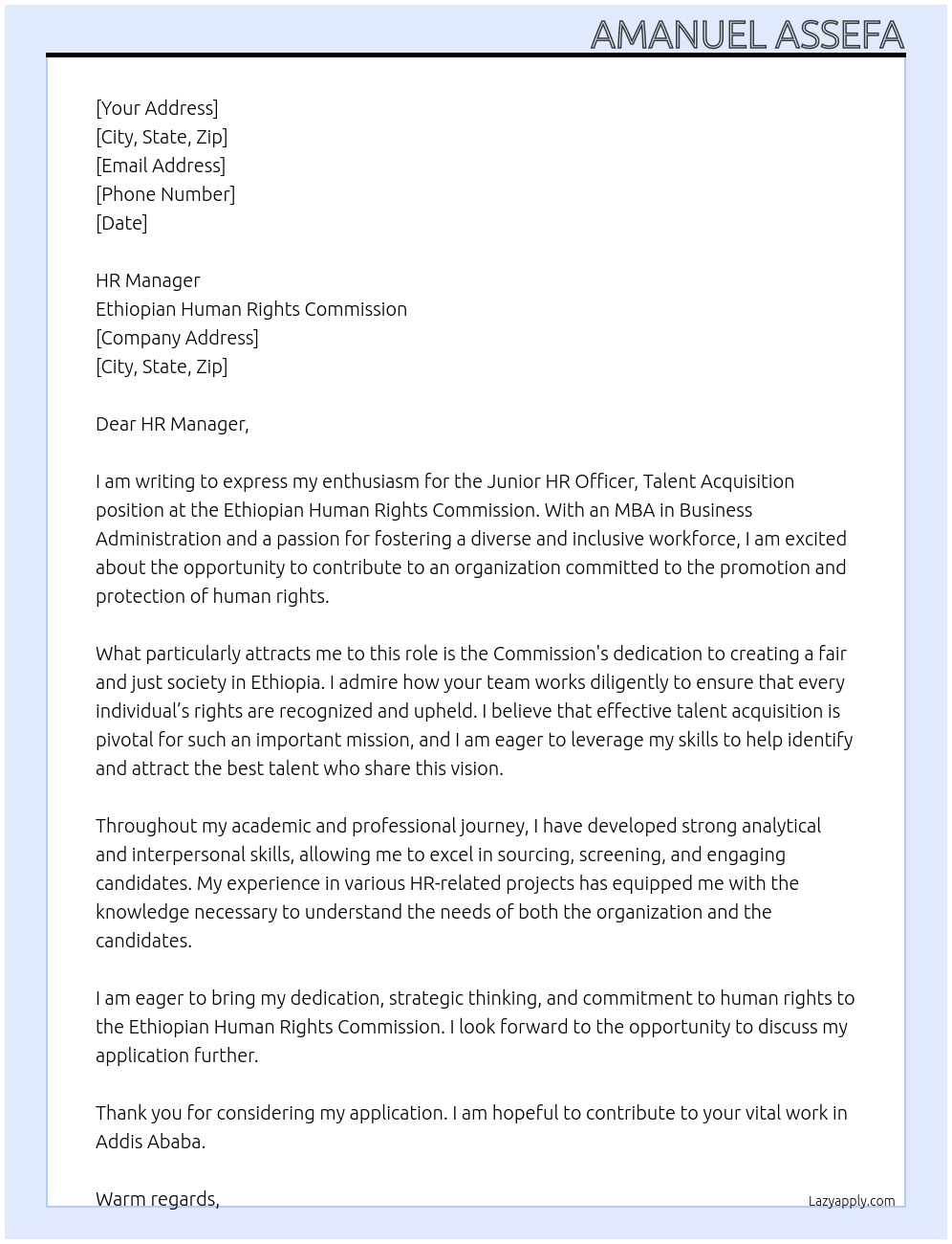 Junior HR office Talent Acquisition Cover Letter At Ethiopian Human Rights Commission