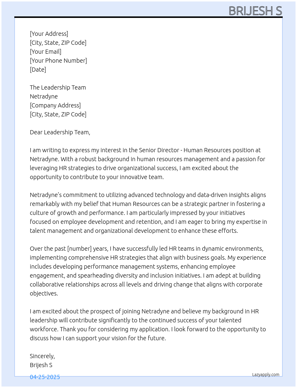 Check out these senior director - human resources cover letter sample and examples previously used by job seekers to land on job interviews as senior director - human resources. Use our AI cover letter generator to create a personalized cover letter as senior director - human resources.
