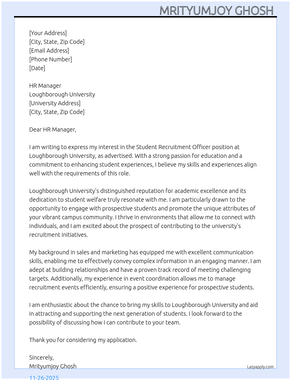 Check out these student recruitment officer cover letter sample and examples previously used by job seekers to land on job interviews as student recruitment officer. Use our AI cover letter generator to create a personalized cover letter as student recruitment officer.