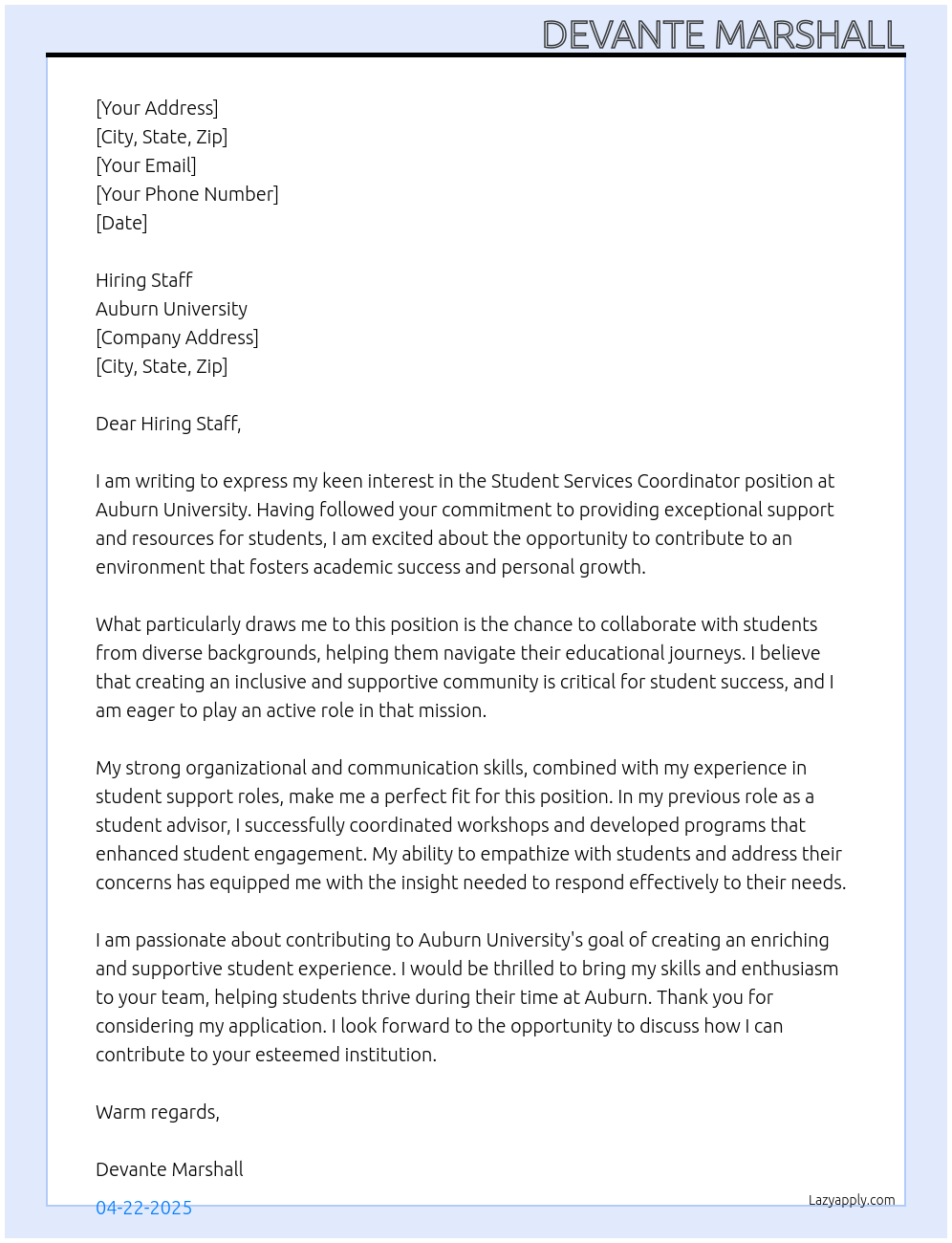 Check out these student services coordinator cover letter sample and examples previously used by job seekers to land on job interviews as student services coordinator. Use our AI cover letter generator to create a personalized cover letter as student services coordinator.