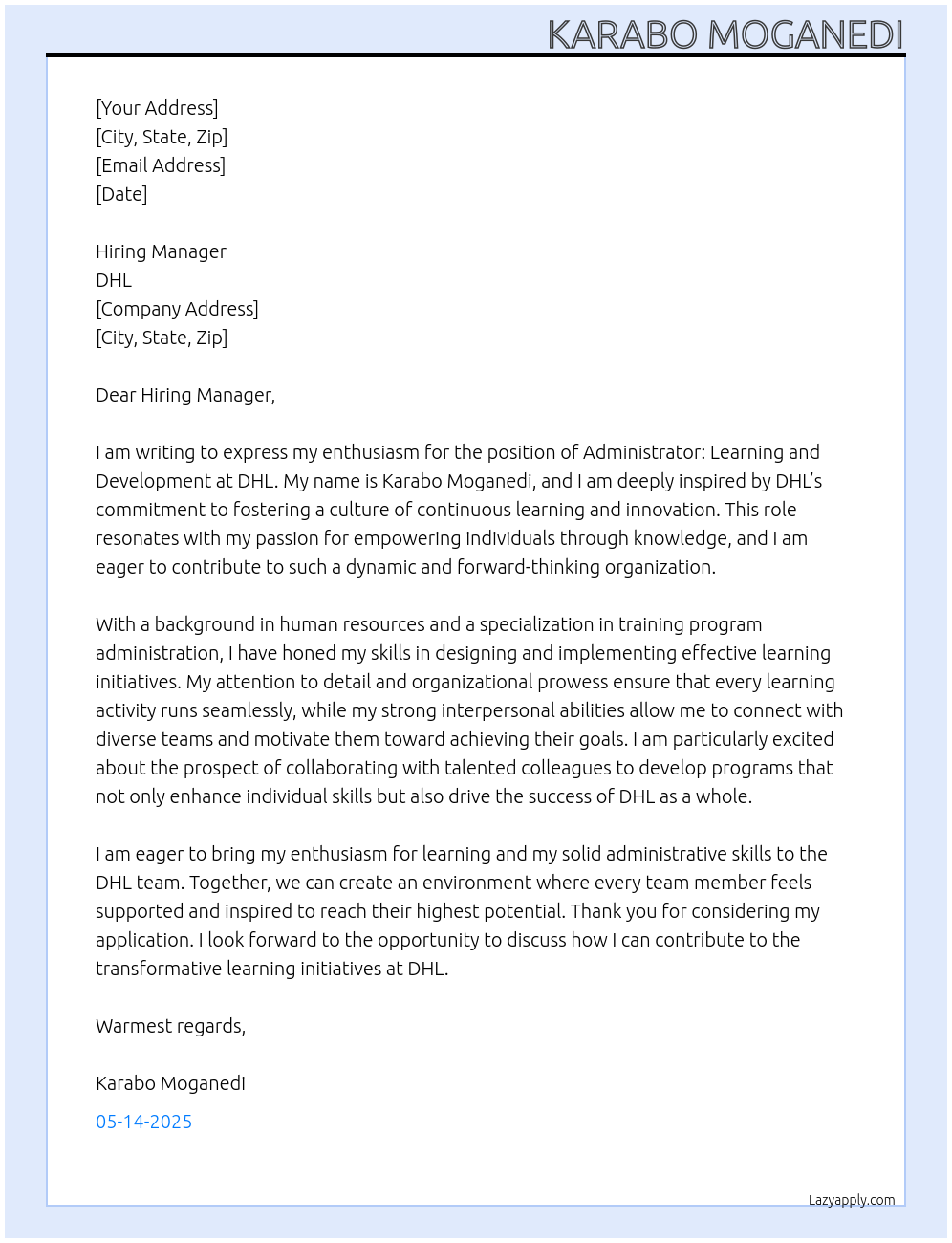 Administrator: Learning and Development Cover Letter At DHL