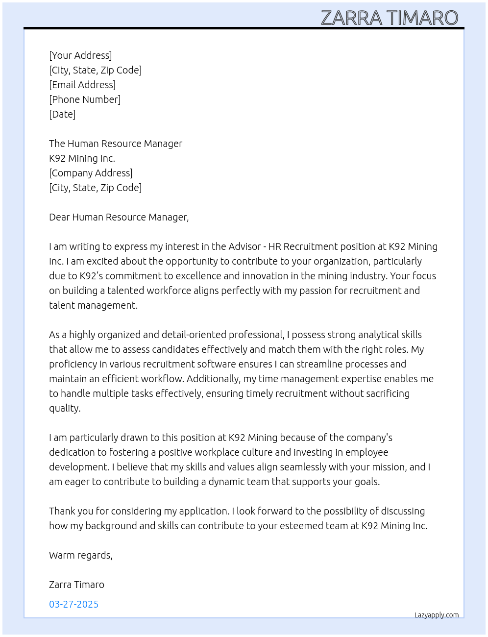 Advisor - HR Recruitment Cover Letter At K92 Mining Inc.