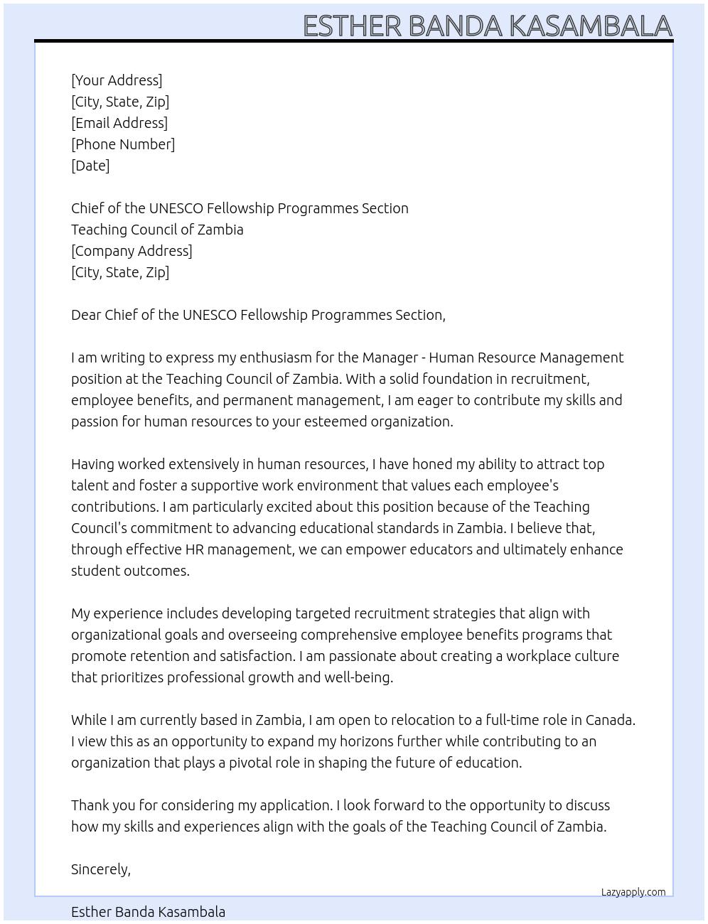Manager - Human Resource Management Cover Letter At Teaching Council of Zambia