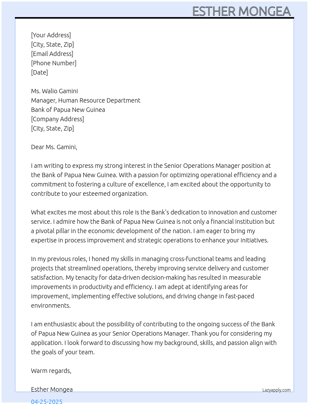 Senior Operations Manager At Bank of PapuaNew Guinea Cover Letter