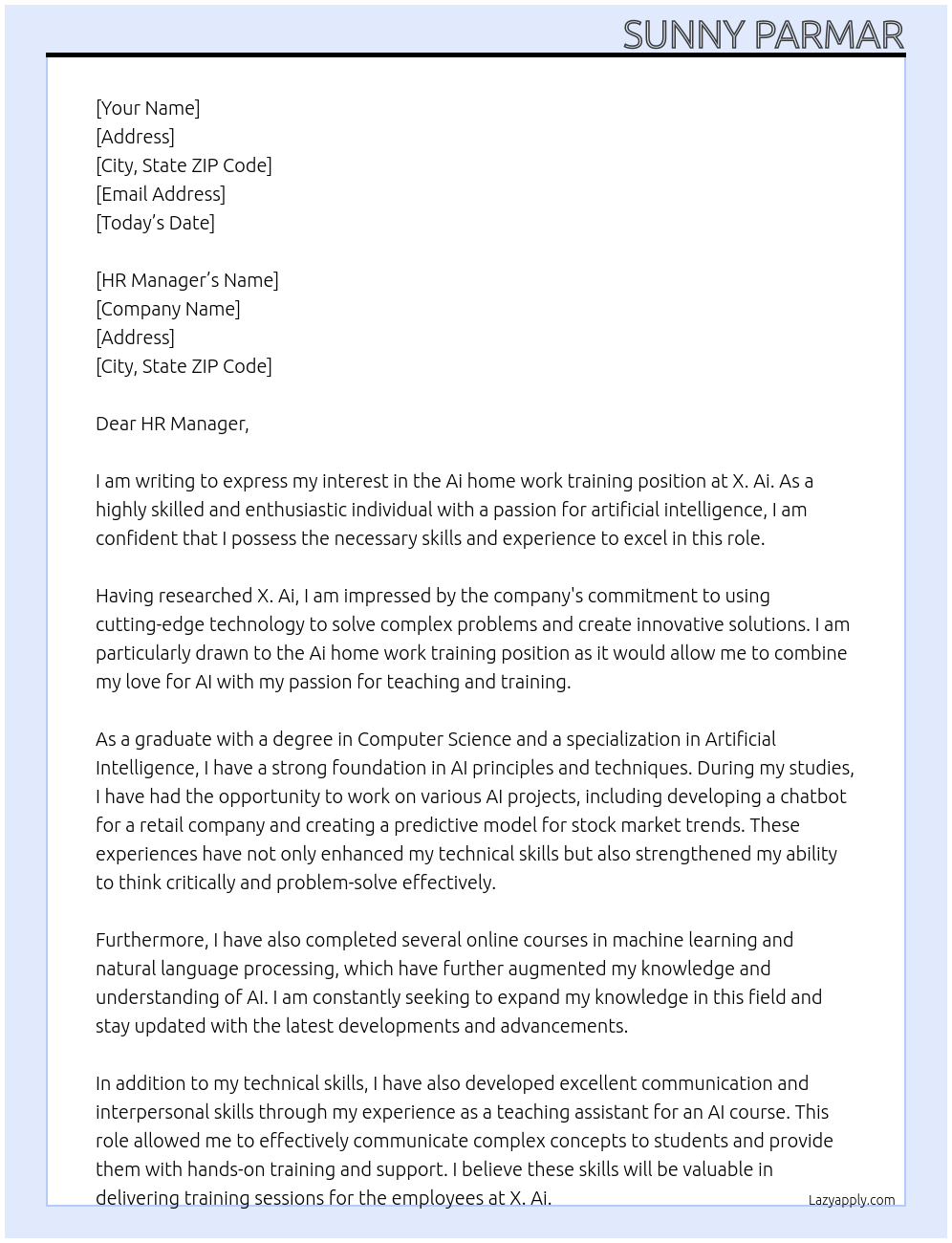 Check out these ai home work training cover letter sample and examples previously used by job seekers to land on job interviews as ai home work training. Use our AI cover letter generator to create a personalized cover letter as ai home work training.