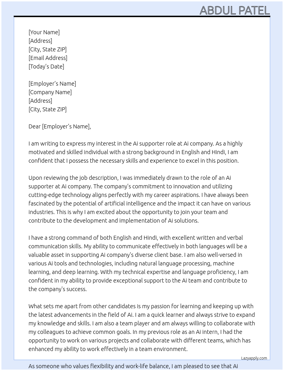 Check out these ai supporter cover letter sample and examples previously used by job seekers to land on job interviews as ai supporter. Use our AI cover letter generator to create a personalized cover letter as ai supporter.