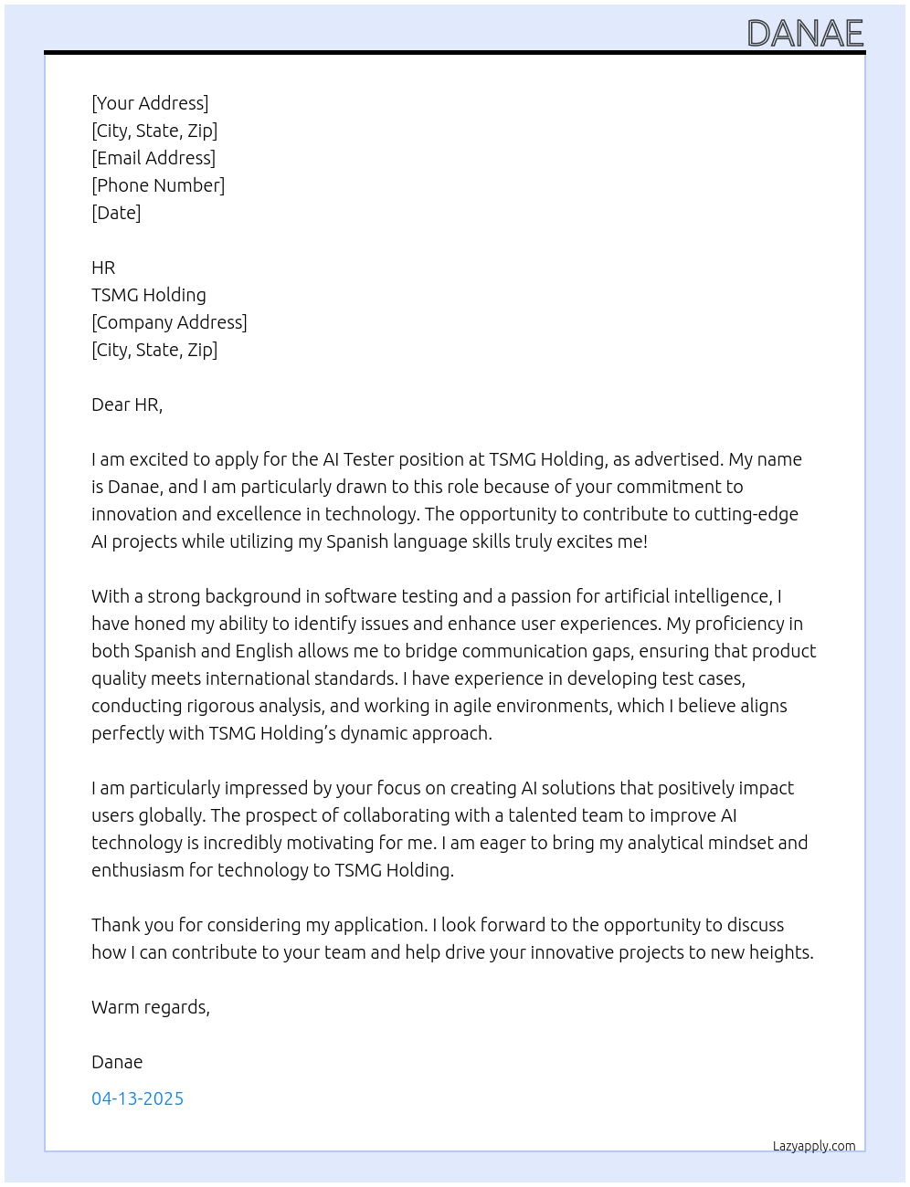 AI tester with Spanish language Cover Letter At TSMG Holding