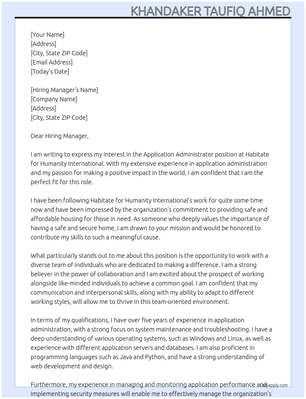 Application Administrator Cover Letter At Habitate for Humanity International