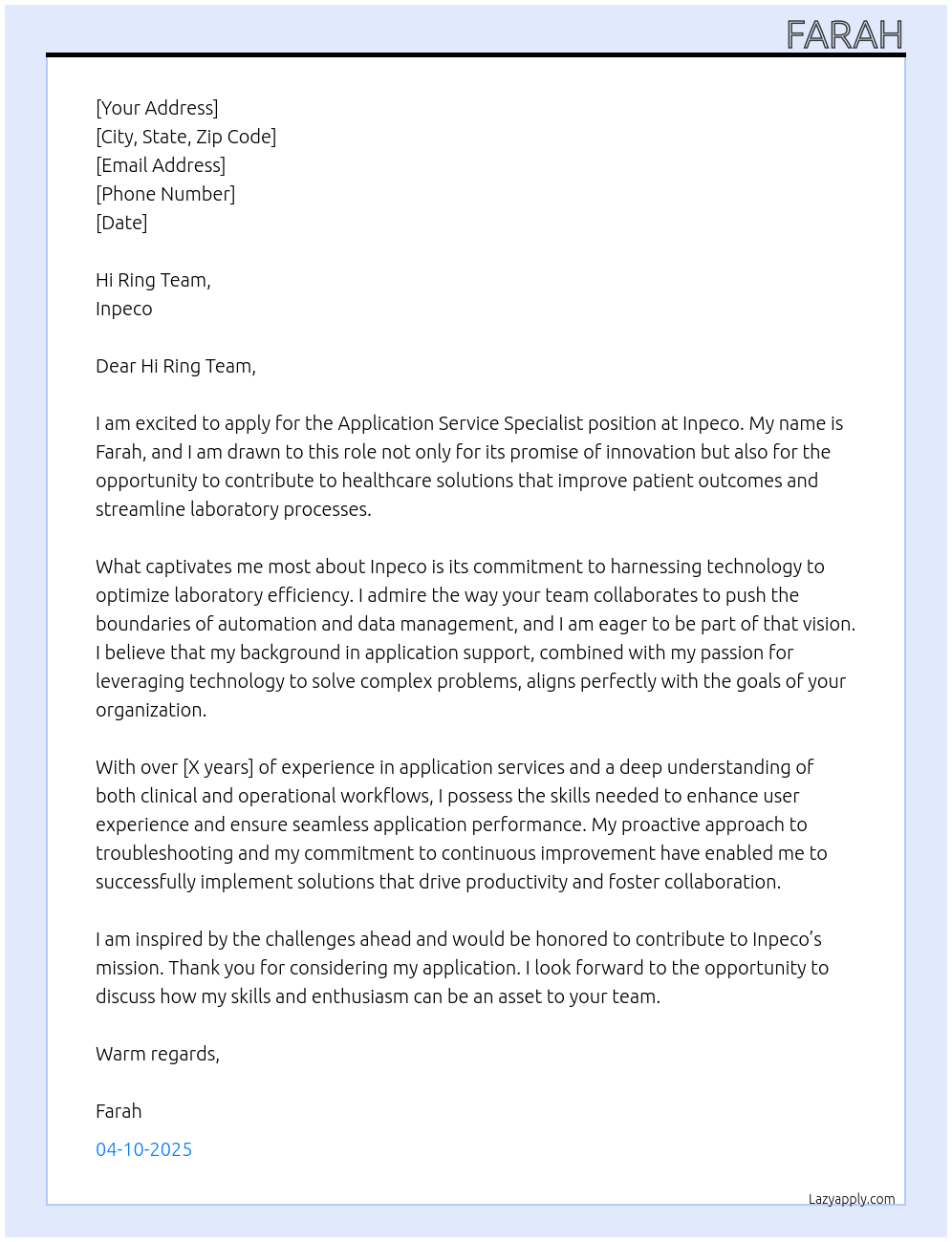 Check out these application service specialist cover letter sample and examples previously used by job seekers to land on job interviews as application service specialist. Use our AI cover letter generator to create a personalized cover letter as application service specialist.