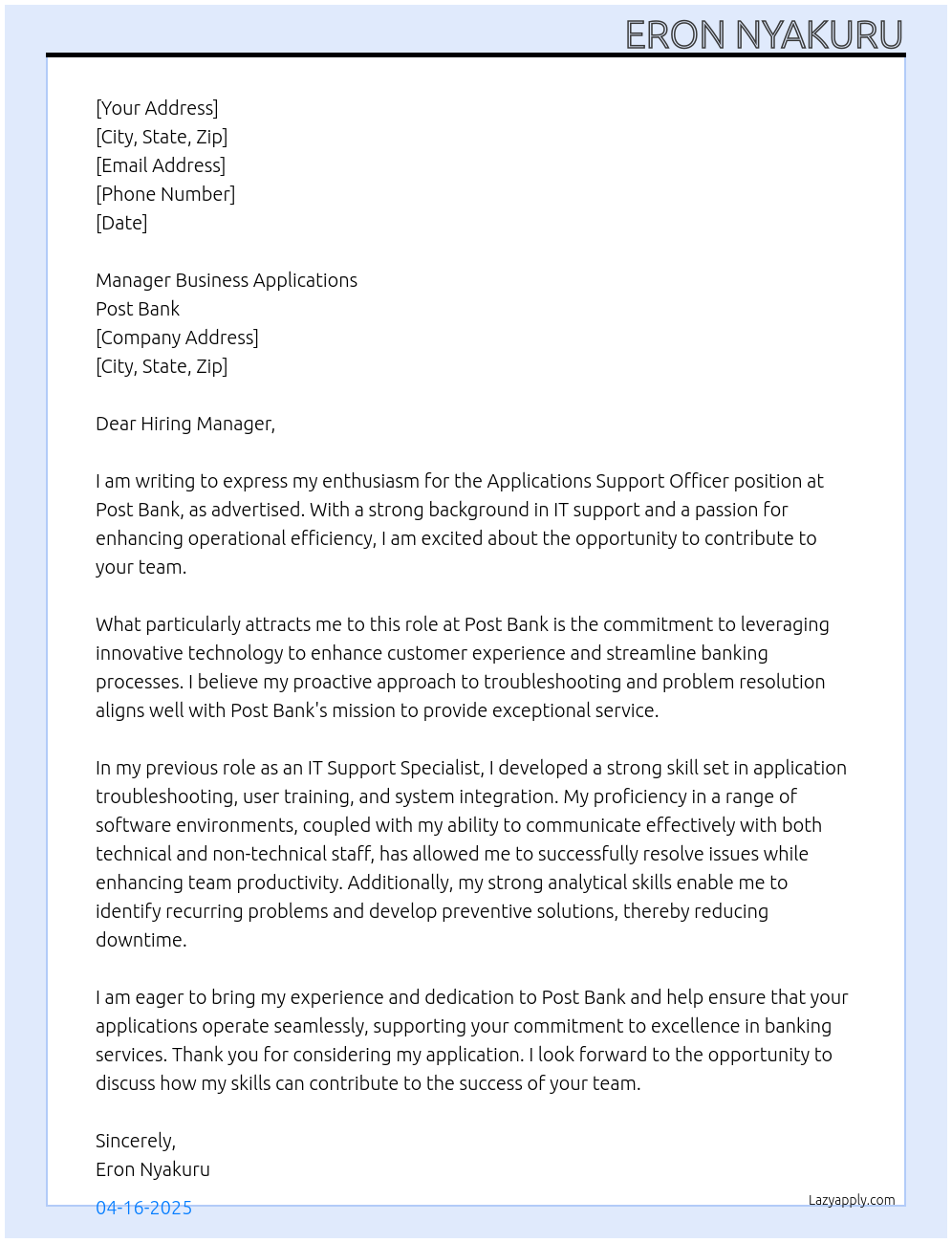 APPLICATIONS SUPPORT OFFICER Cover Letter At Post Bank