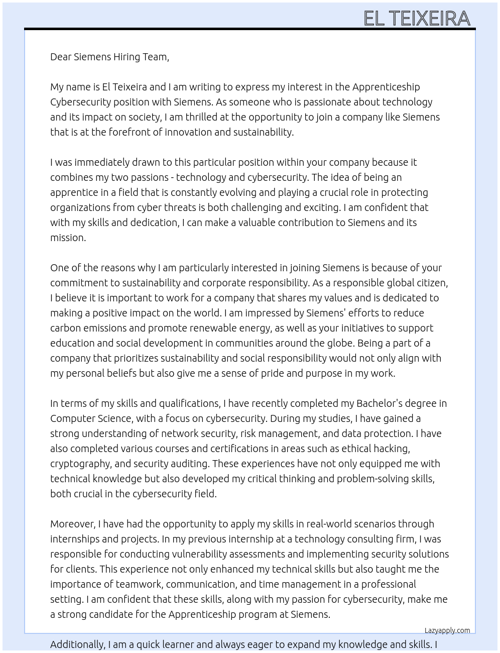 Apprenticeship cybersecurity Cover Letter At Siemens