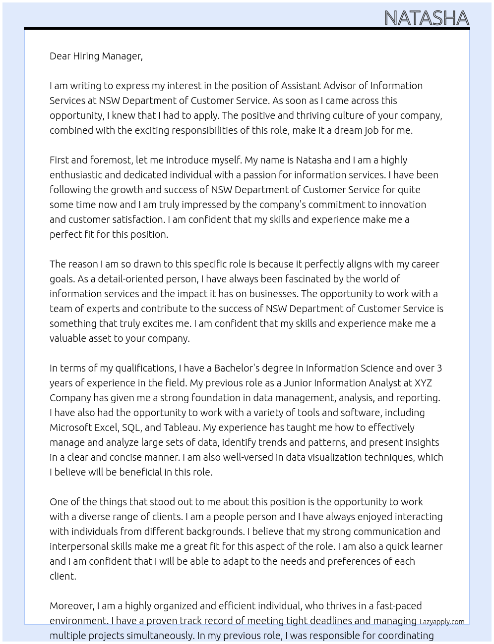 Assistant Advisor information services Cover Letter At NSW Department of Customer Service